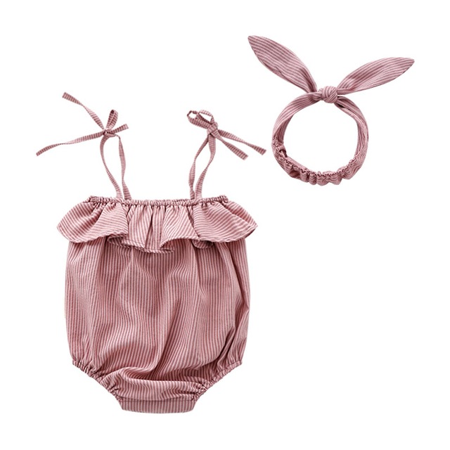 【べビー】とってもかわいい ヘアバンド付き フリル付きロンパース 赤ストライプ 66 73 80 90cm