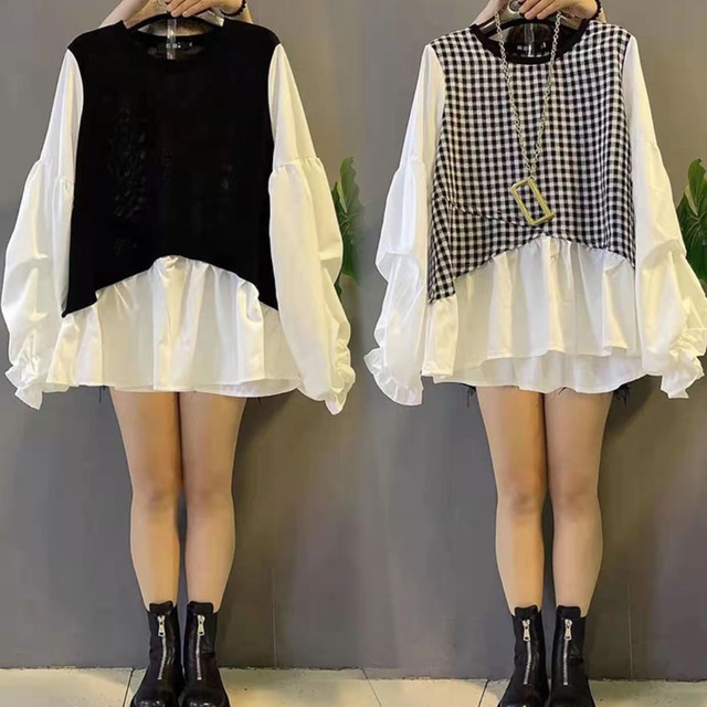 トップス ブラウス 袖あり 七分袖 ボリューム袖 Uネック ペプラム Aライン 切り替えデザイン ドッキング 大人可愛い カジュアル おしゃれ お洒落 こなれ感 ラブリー キュート ガーリー 主役級 存在感 チェック柄 春 夏 秋 冬 オールシーズン シーズンレス 2022 2023 10代 20代 30代 レディース 女性用 女の子 学生 通学 デート お出かけ 女子会 ホテル ガーデン レストラン 重ね着 コーデ 楽ちん モテ 体系カバー 3XL 4XL 5XL 6XL 黒 ブラック
