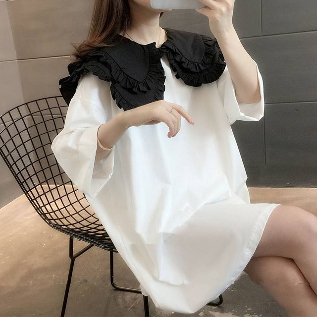 ワンピース チュニック 白シャツ 白トップス Tシャツワンピース ミニ ミニ丈 ショート丈 袖あり 7分袖 七分袖 ドロップショルダー ラウンドネック 襟付き ビッグ襟 ビッグカラー ワイド Iライン フリル かわいい 大人可愛い きれいめ シンプル カジュアル 大人 上品 おしゃれ お洒落 レトロ 大人女子 こなれ感 ラフ キュート ガーリー ルーズ エレガント 主役級 存在感 フェミニン クラシカル ロマンチック 無地 春 夏 デート お出かけ 休日 着回し 普段使い 楽ちん モテ ゆったり ゆる