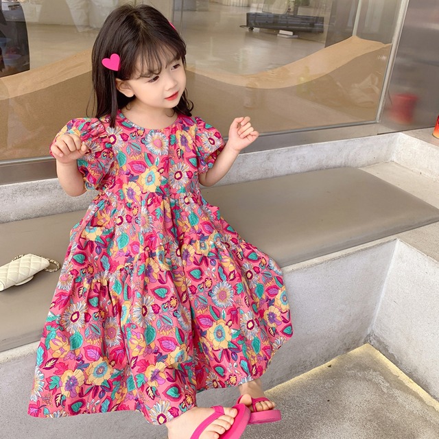 【子ども】バルーン袖ピンクの花柄ワンピース 80 90 100 110 120 130cm