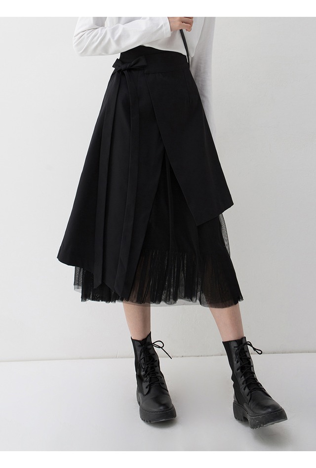 スカート チュールスカート 膝下 ワイド アシンメトリー 切り替えデザイン チュール リボン ウエストリボン 切り替えデザイン ポリエステル 異素材MIX おしゃれ お洒落 かっこいい 個性的 クール 主役級 存在感 無地 春 夏 秋 10代 20代 学生 お出かけ 休日 パーティー イベント 韓国 S M L 黒 ブラック