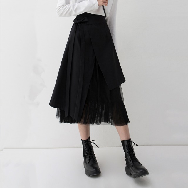アシンメトリーなデザインが個性的なミモレ丈スカートです。 全体的にシックでカッコイイ印象でありながら、ウエストリボンやチュールが可愛らしさも兼ねそろえた魅力的な一着です。 色展開 ブラック サイズ S M L サイズ(cm) S /スカート丈 77 /ウエスト 64 /ヒップ 92 M /スカート丈 78 /ウエスト 68 /ヒップ 96 L /スカート丈 79 /ウエスト 72 /ヒップ 100 <ご注意> ◆画像はご覧になっているパソコン・モニター等により実際の商品と多少色味が異なる場合がございます。色味が違う等のクレームはお受けできませんので予め、ご了承下さい。 ◆平置き・メジャー採寸ですので、サイズ表記に若干の誤差が生じる場合がございます。 ◆当サイトは複数店舗で販売している関係で、ご注文のタイミングによっては在庫にズレが生じ、商品をご用意できない場合がございます。 その場合には誠に恐れ入りますが、ご注文後にお取り消しの手続きをさせていただきますので予めご了承いただけますと幸いです。 ◆送料、発送予定日数につきましては、ショッピングガイドをご覧ください。 LBS-0897