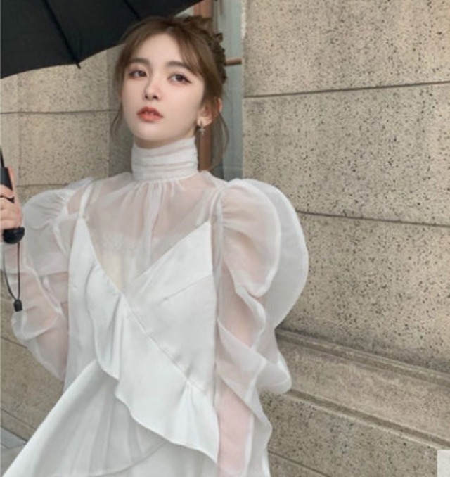 トップス ワンピース ブラウス ロングスカート 袖あり ハイネック 襟なし Aライン スマート レース フリル ポリエステル かわいい キュート 無地 春 10代 20代 レディース デート 女子会 お泊まり 休日 モテ S M L XL 白 ホワイト