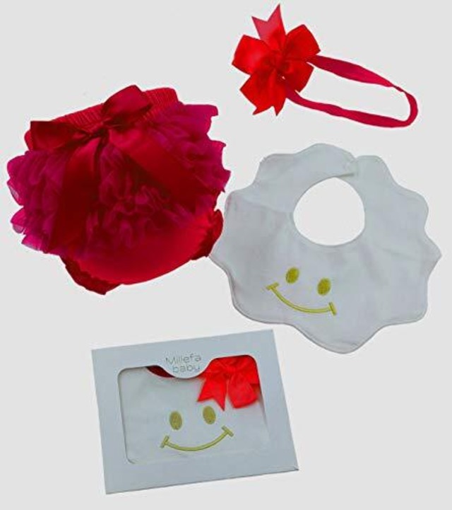 Millefa Baby ギフトBOX付き!ベビー 女の子 ギフト3点セット(フリルブルマ・スタイ・ヘアバンド)【レッド】