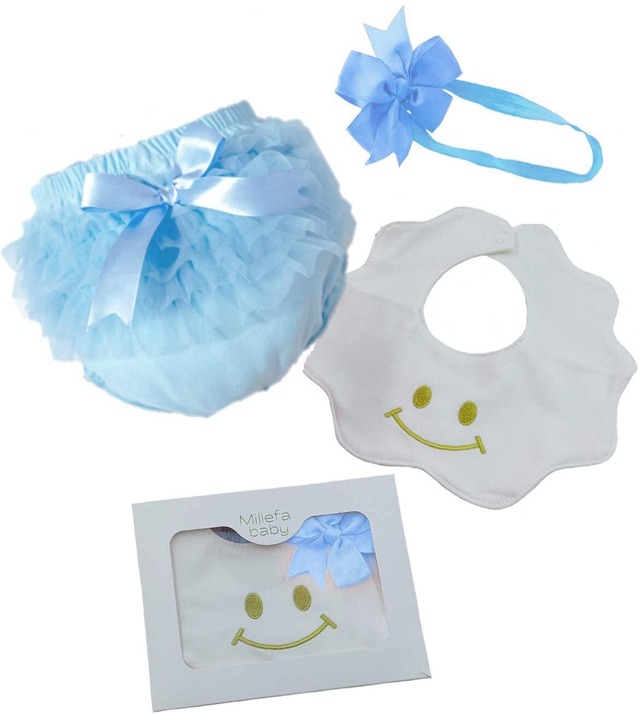 Millefa Baby ギフトBOX付き!ベビー 女の子 ギフト3点セット(フリルブルマ・スタイ・ヘアバンド)【ブルー】