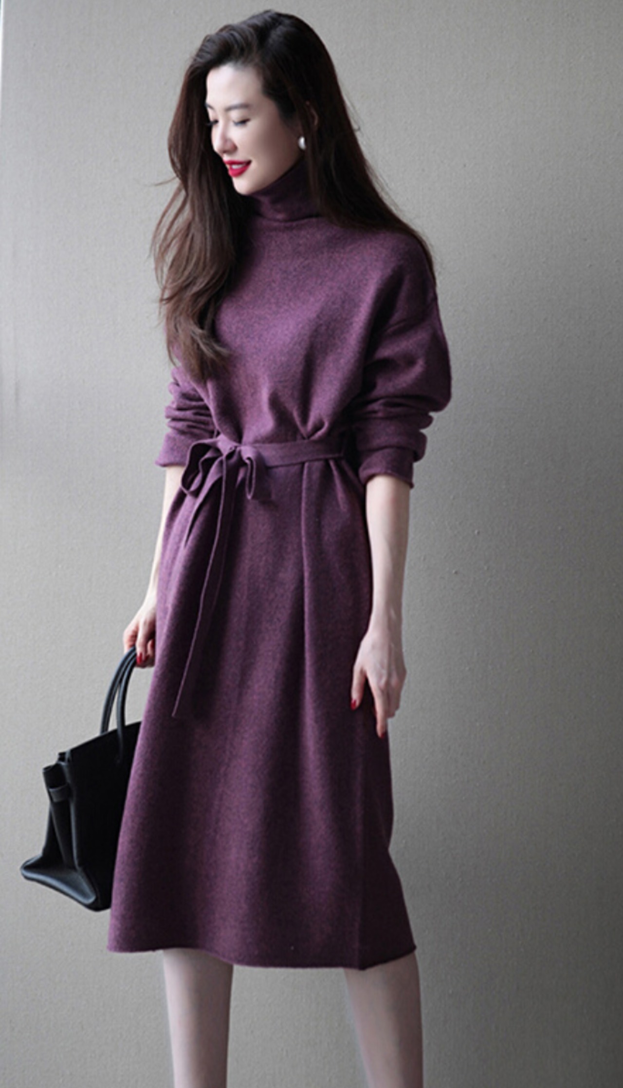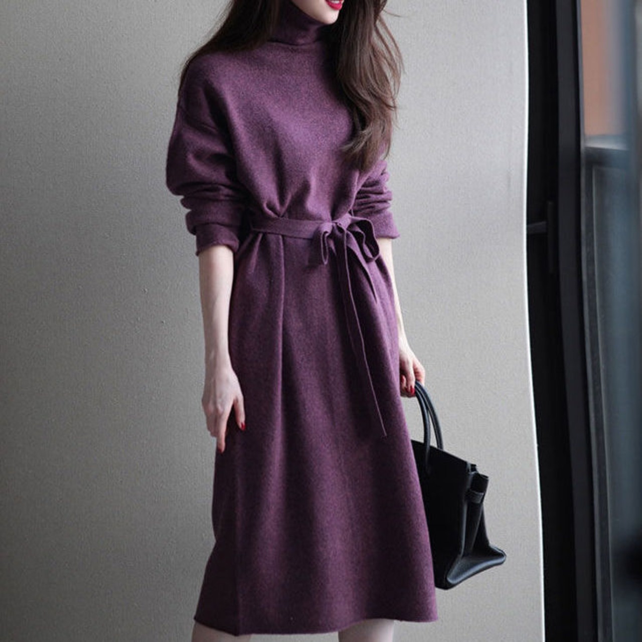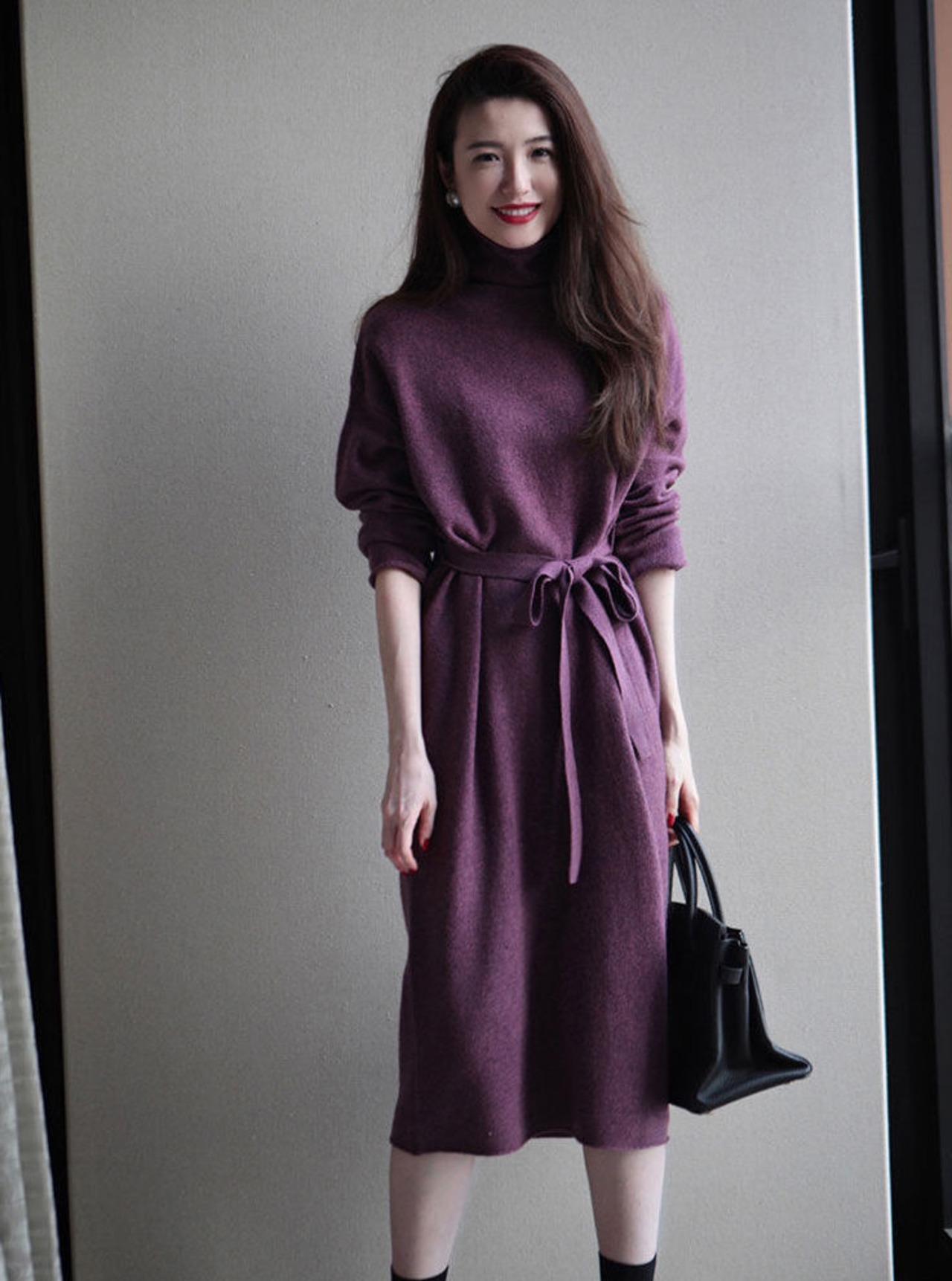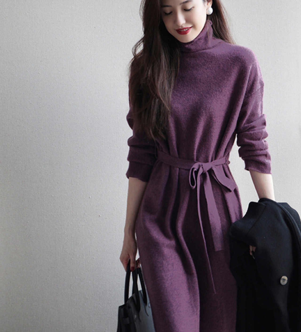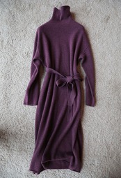 定番のタートルネックニットワンピースですが、落ち着いたお色味のパープルとウエストのリボンがフェミニンな雰囲気を演出します。