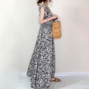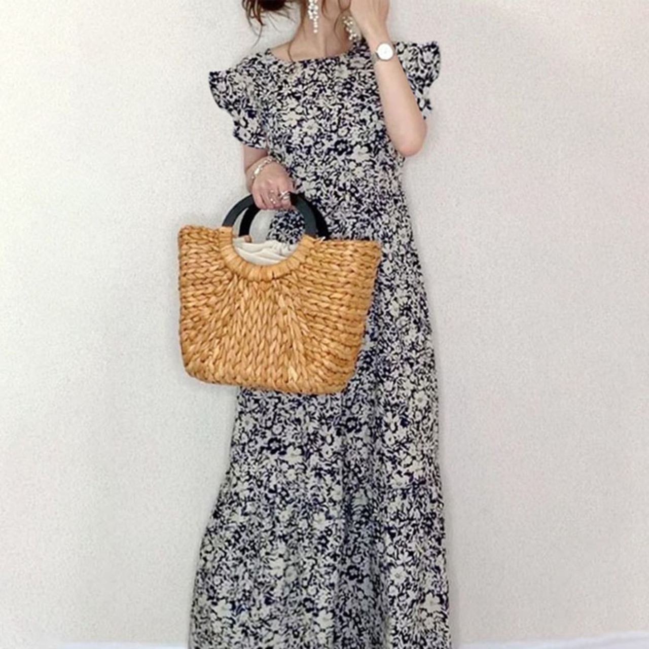 ワンピース フレアワンピース ロング ロング丈 フレアスリーブ フレンチスリーブ ラウンドネック フレア Aライン ハイウエスト 伸縮性 綿 かわいい 大人可愛い おしゃれ ラフ ラブリー キュート ガーリー 柄 リーフ柄 夏 2022 10代 20代 30代 レディース 女性用 OL 学生 通学 デート お出かけ 女子会 休日 イベント リゾート 旅行 海 プール 普段使い 楽ちん モテ 体系カバー フリーサイズ 黒 ブラック
