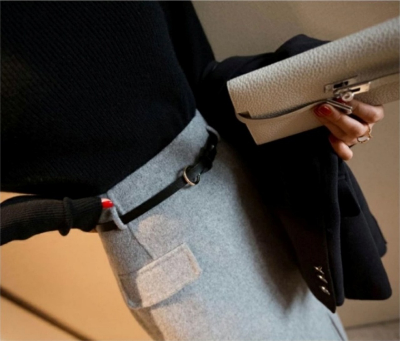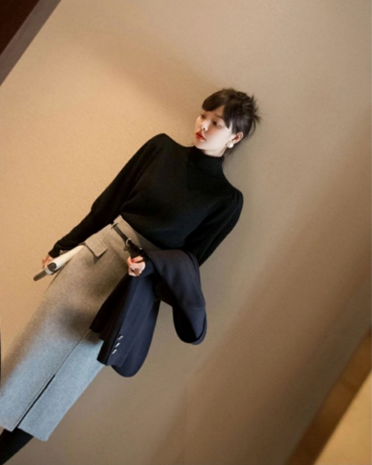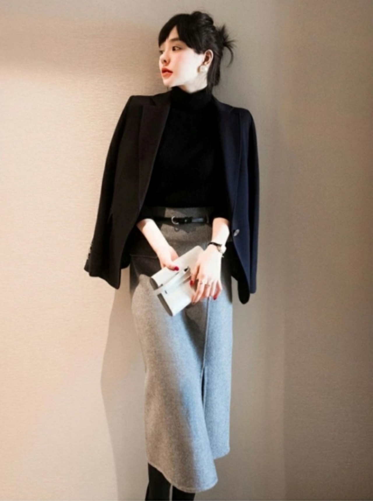きれいめなニットソーとペンシルスカートのセットアップコーデです。