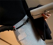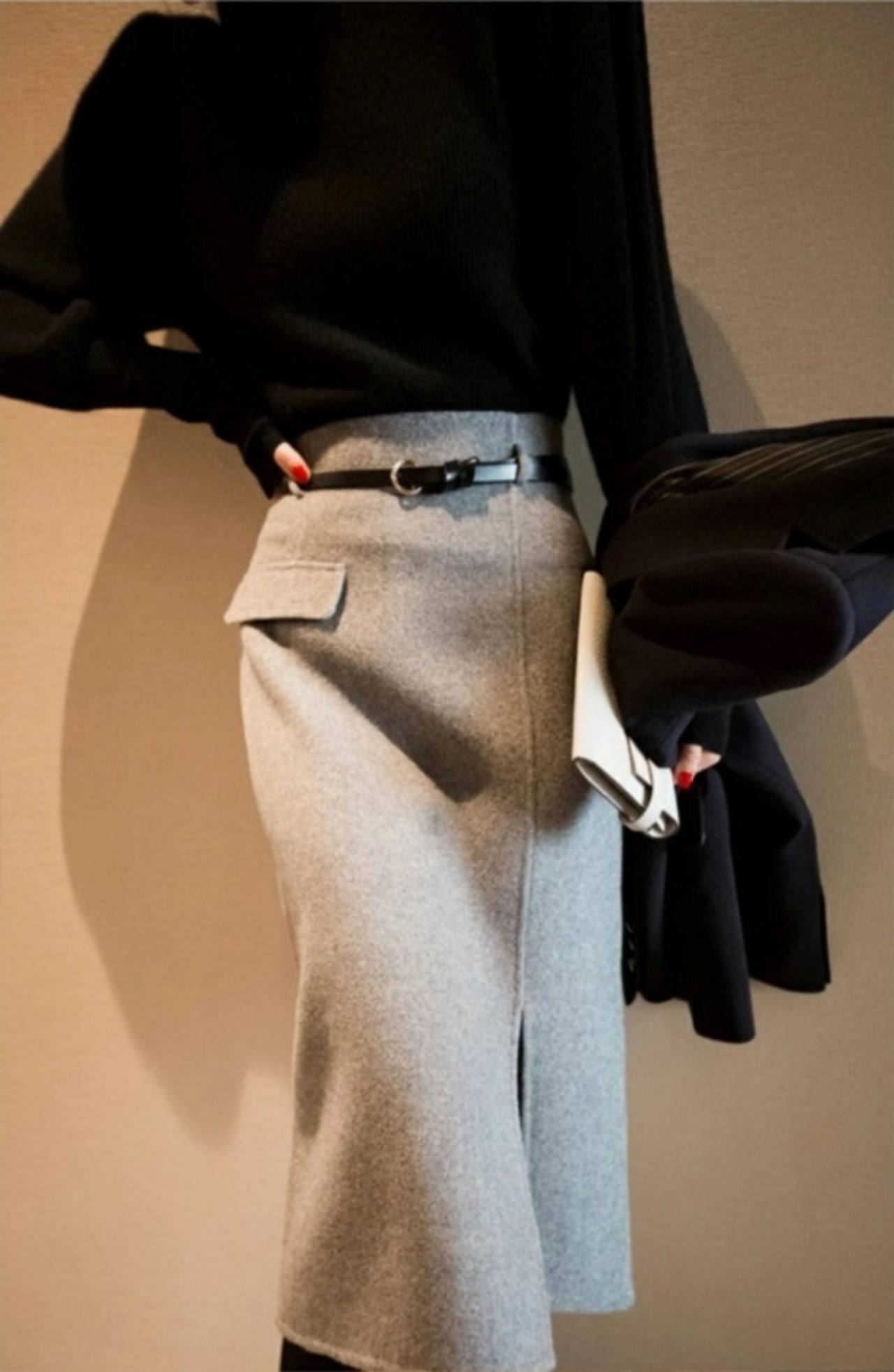 ハイウエストのミディ丈スカートで上品にスタイルアップします。