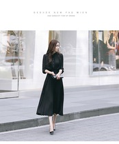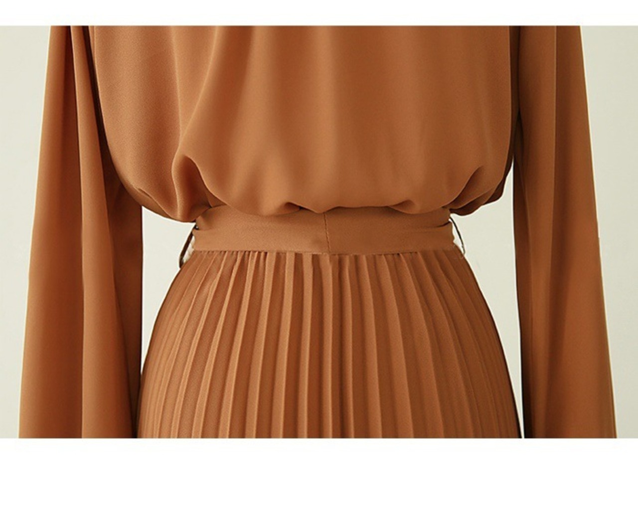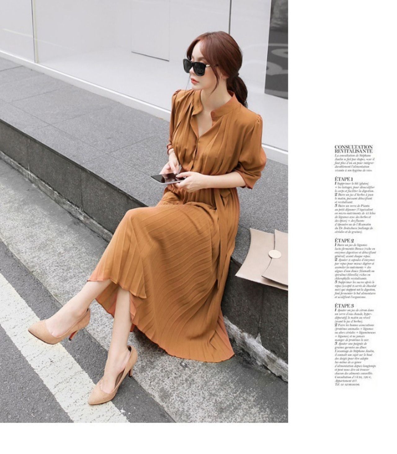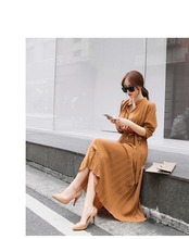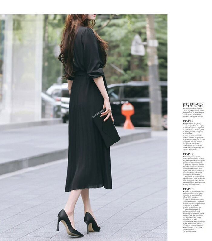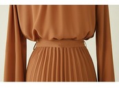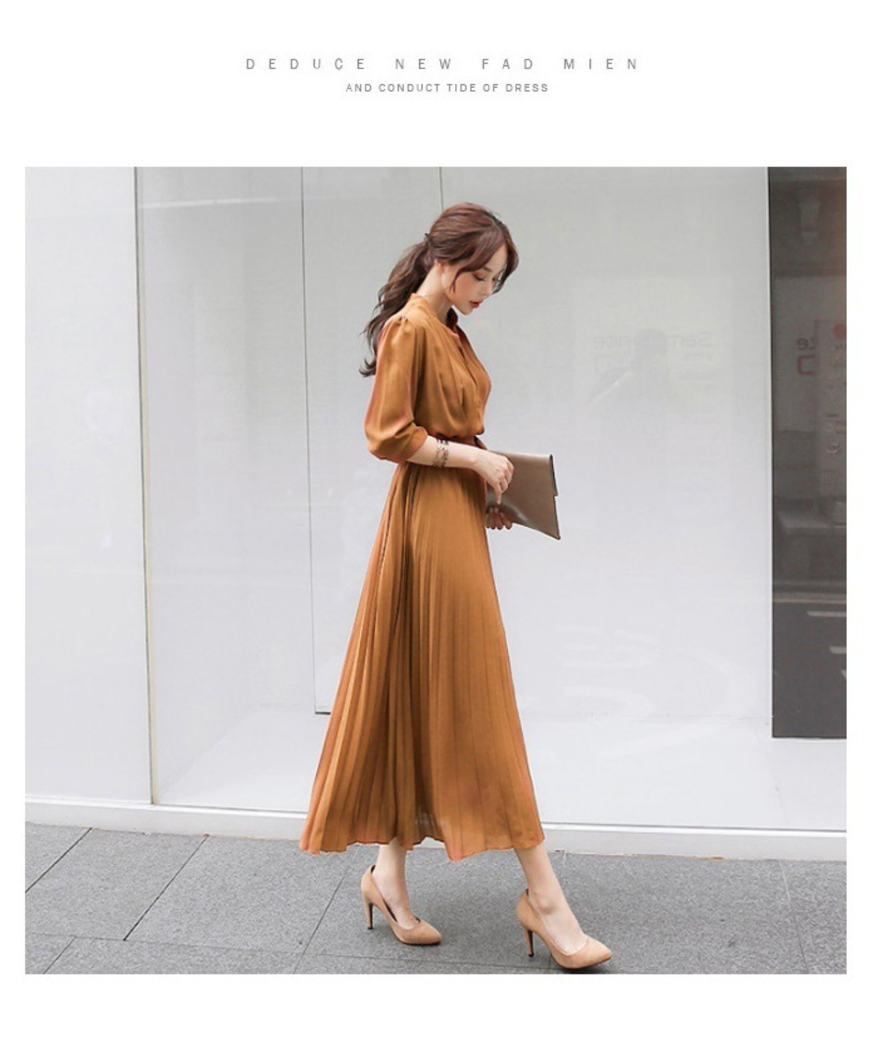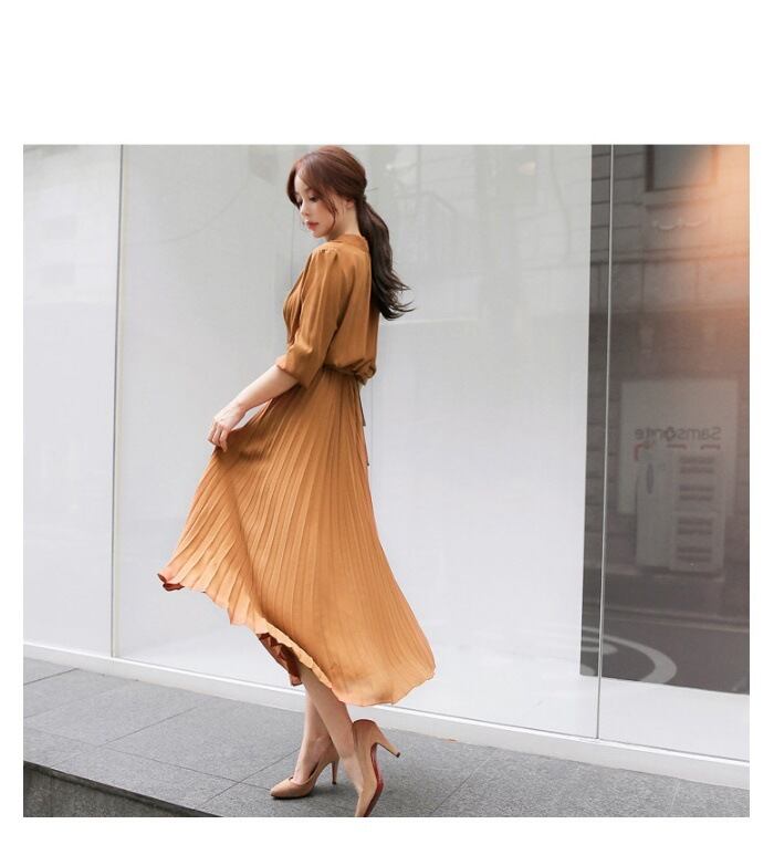 細かいプリーツがエレガントなミモレ丈ワンピース。