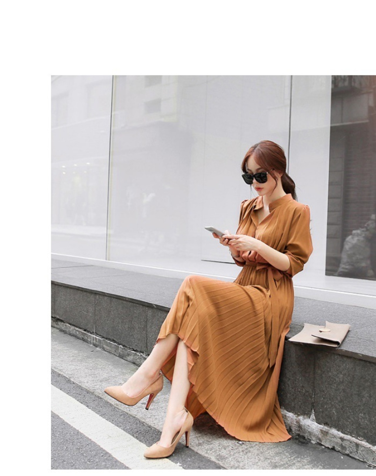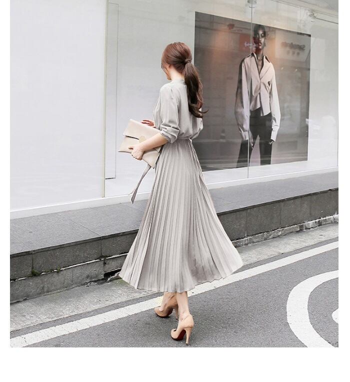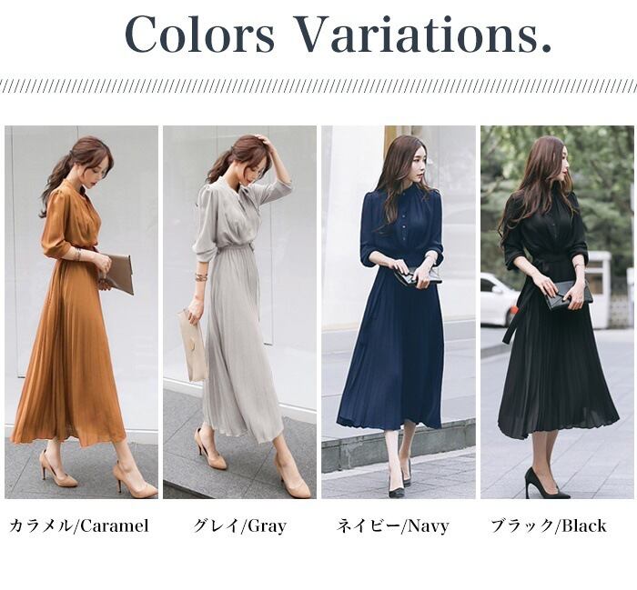ワンピース シャツワンピース ミモレ ミモレ丈 袖あり 長袖 スタンドカラー フレア Aライン プリーツ シフォン リボン ウエストマーク ウエストリボン ハイウエスト かわいい 大人可愛い きれいめ シンプル 大人 上品 おしゃれ お洒落 大人女子 こなれ感 エレガント とろみ感 無地 春 秋 10代 20代 30代 レディース オフィス ビジネス OL 通勤 学生 通学 デート お出かけ 女子会 休日 普段使い 脚長 S M L XL 2XL ブラック ブルー グレー ネイビー 大人カラー 秋カラー