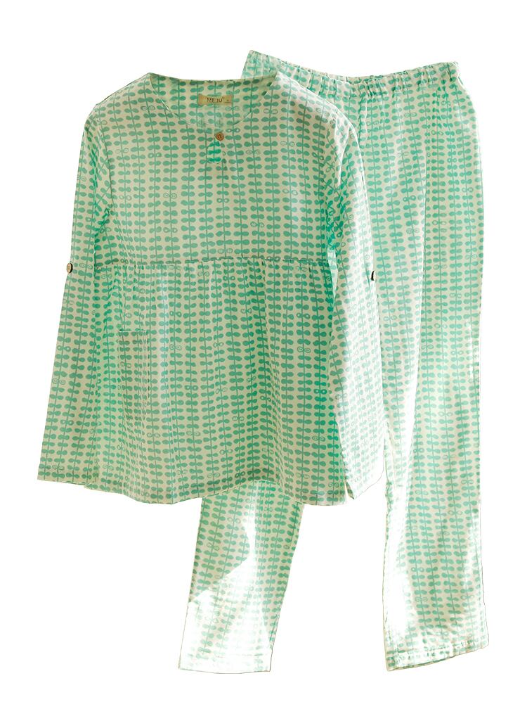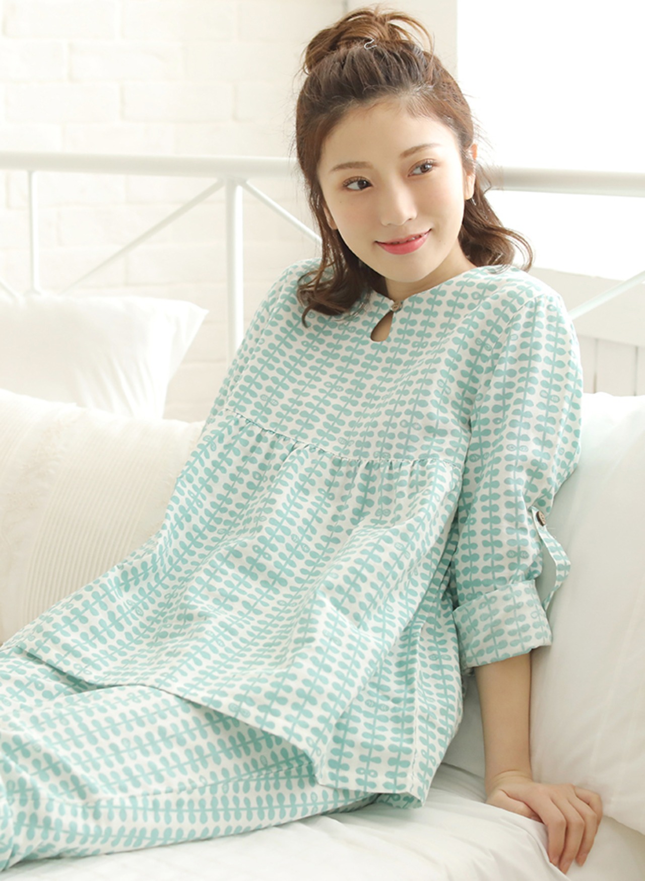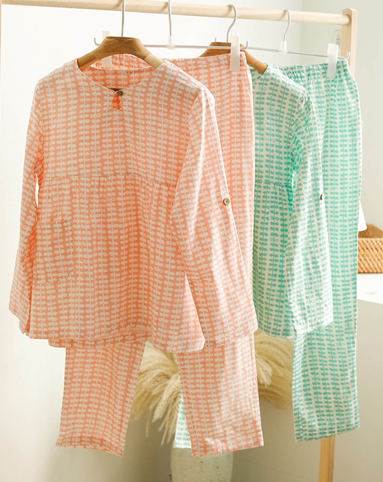 ルームウェア パジャマ 部屋着 ナイトウェア 長袖 ロールアップボタン付き ラウンドネック 綿 ガーゼ 上下セット かわいい 大人可愛い キュート ガーリー ピーナッツ柄 春 秋 10代 20代 30代 レディース 女性用 OL 学生 お泊まり 楽ちん リラックス グリーン オレンジ