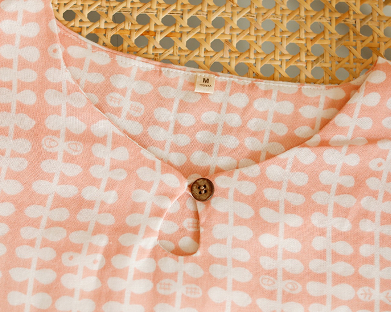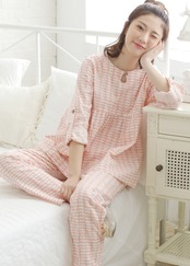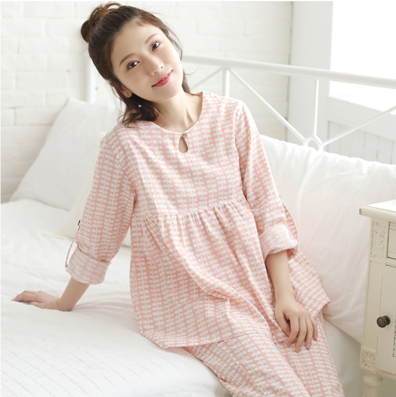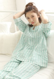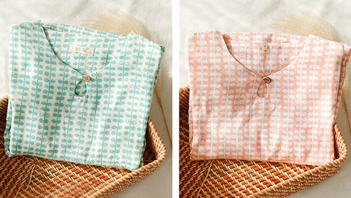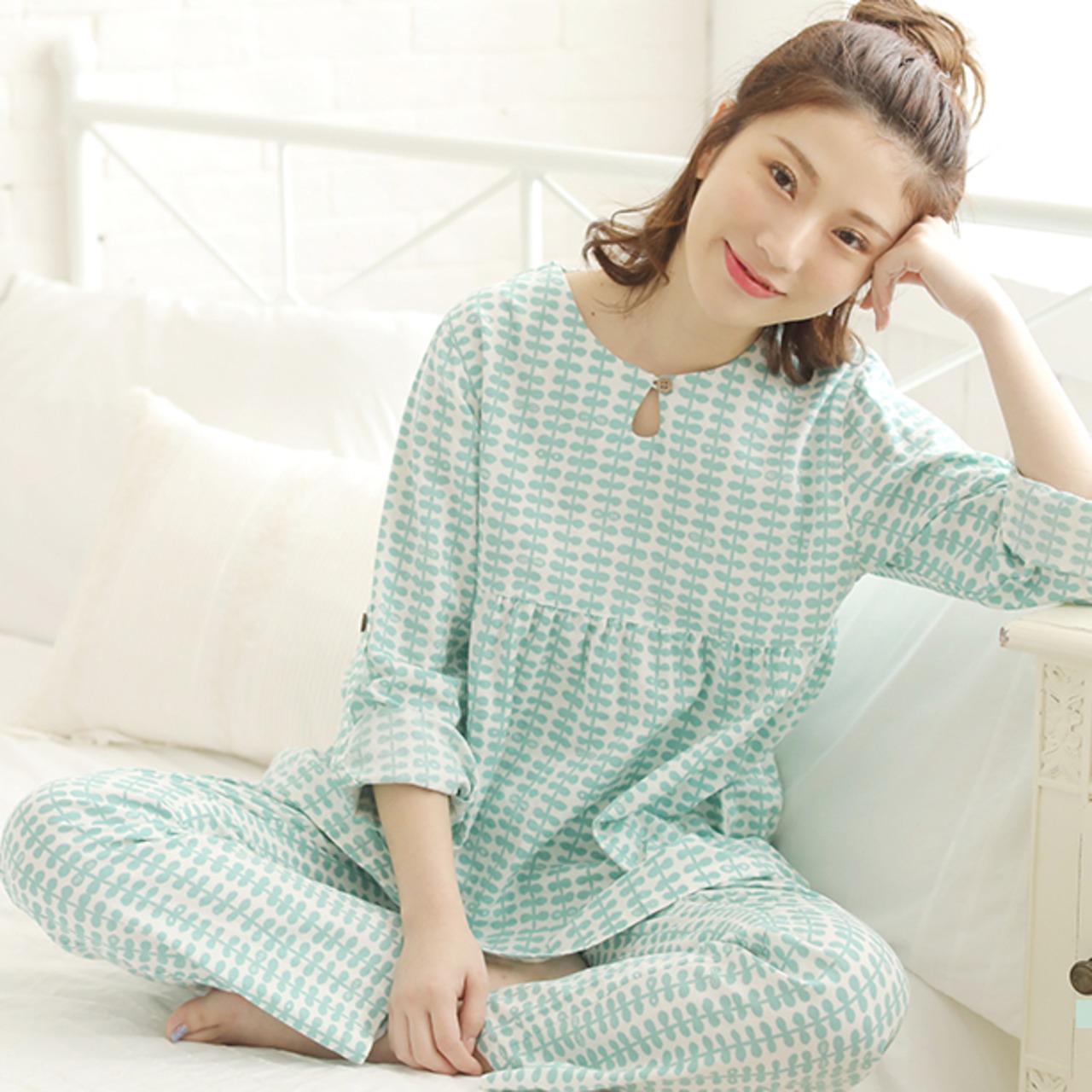 ルームウェア パジャマ 部屋着 ナイトウェア 長袖 ロールアップボタン付き ラウンドネック 綿 ガーゼ 上下セット かわいい 大人可愛い キュート ガーリー ピーナッツ柄 春 秋 10代 20代 30代 レディース 女性用 OL 学生 お泊まり 楽ちん リラックス グリーン オレンジ