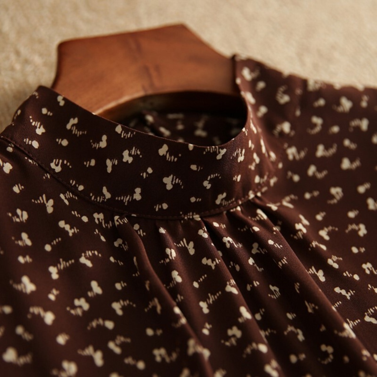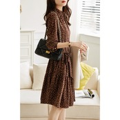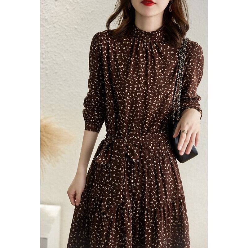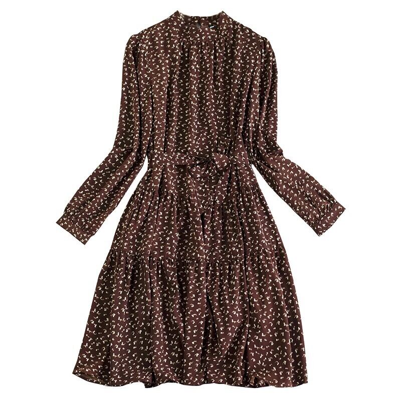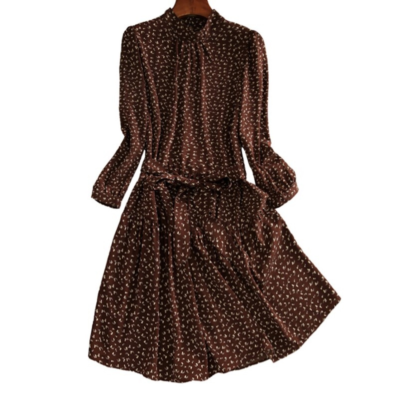 ワンピース フレアワンピース 膝丈 ひざ丈 ミディアム丈 長袖 クルーネック スタンドカラー フレア Aライン リボン ウエストマーク ウエストリボン ハイウエスト かわいい 大人可愛い きれいめ シンプル 大人 上品 おしゃれ お洒落 大人可愛い 大人女子 キュート ガーリー エレガント 柄 総柄 春 秋 10代 20代 レディース 学生 通学 デート お出かけ 女子会 休日 普段使い モテ 体系カバー 脚長 S M L XL 2XL ゆったり ブラウン