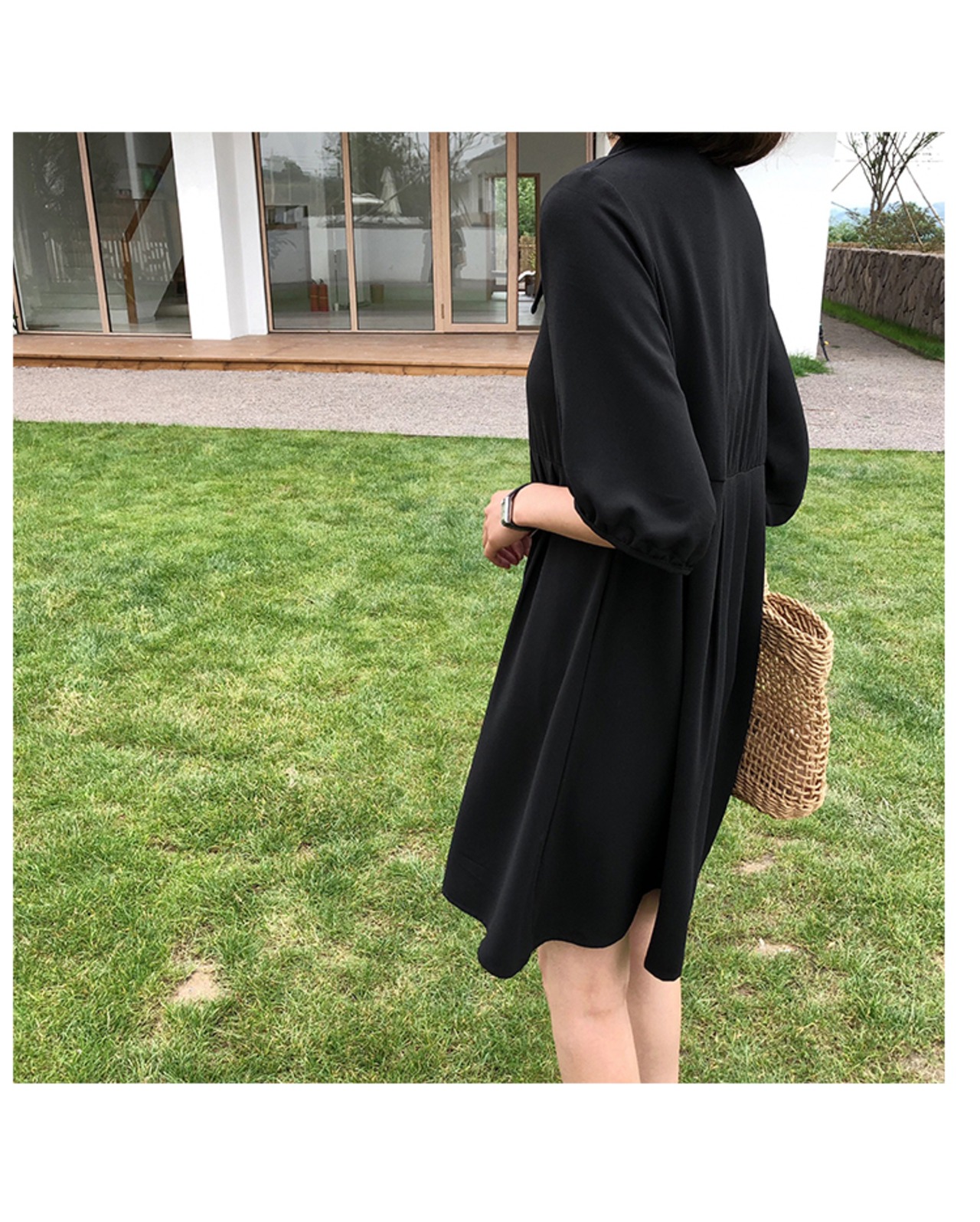 Vネックで首周りを、ふんわりとした五分袖で二の腕をカバーしスタイルアップに期待できます。