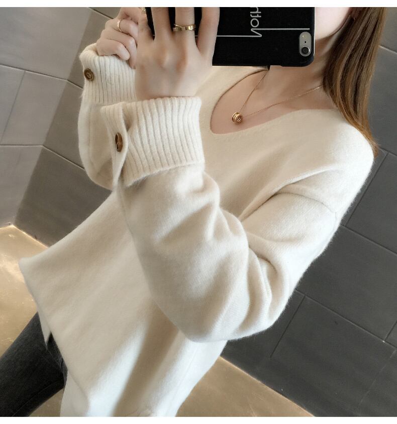 Vネックで首周りをスッキリと見せ、小顔効果も抜群です。