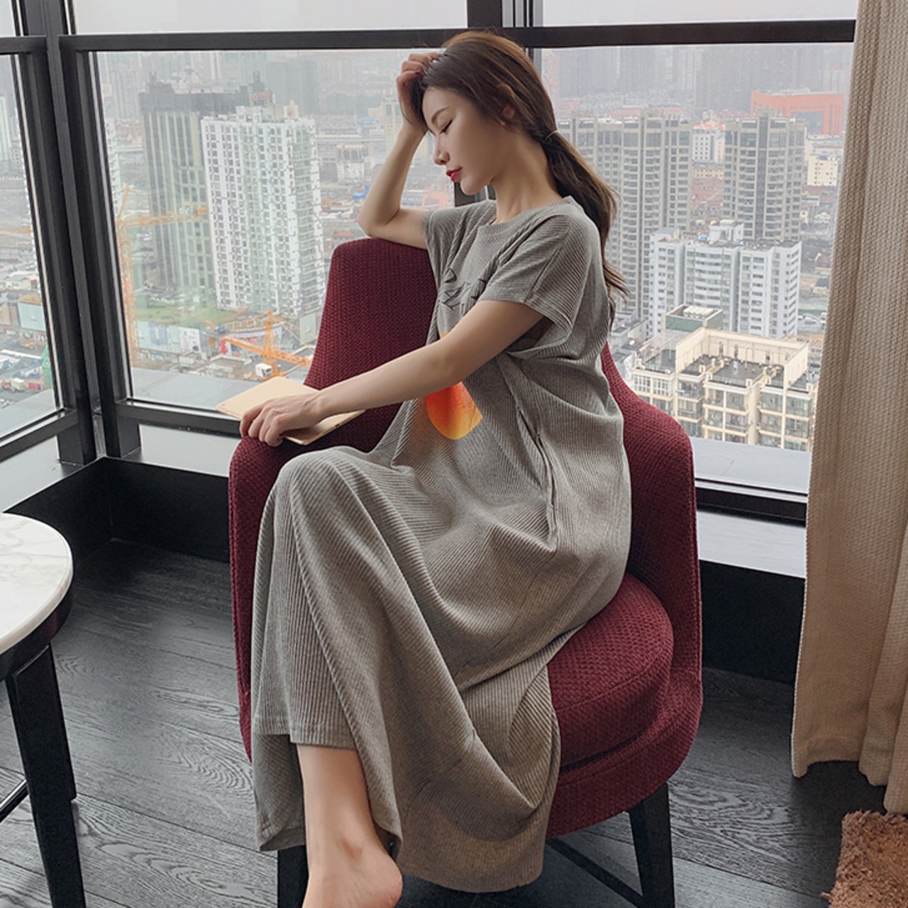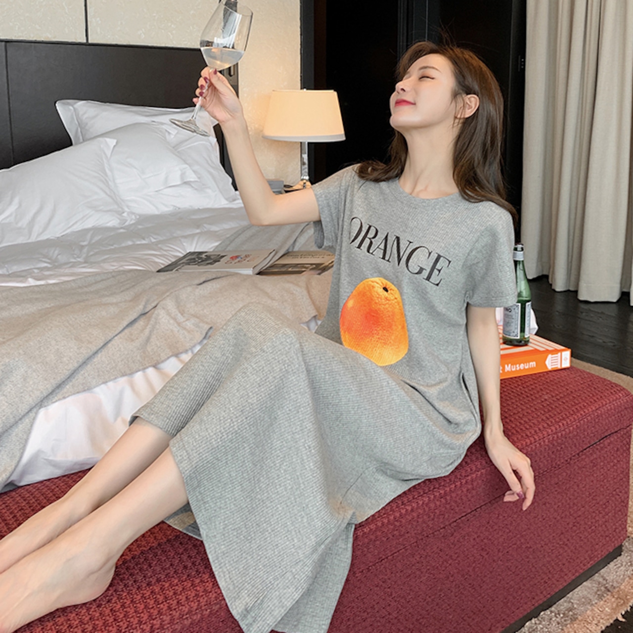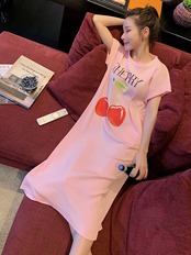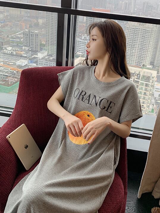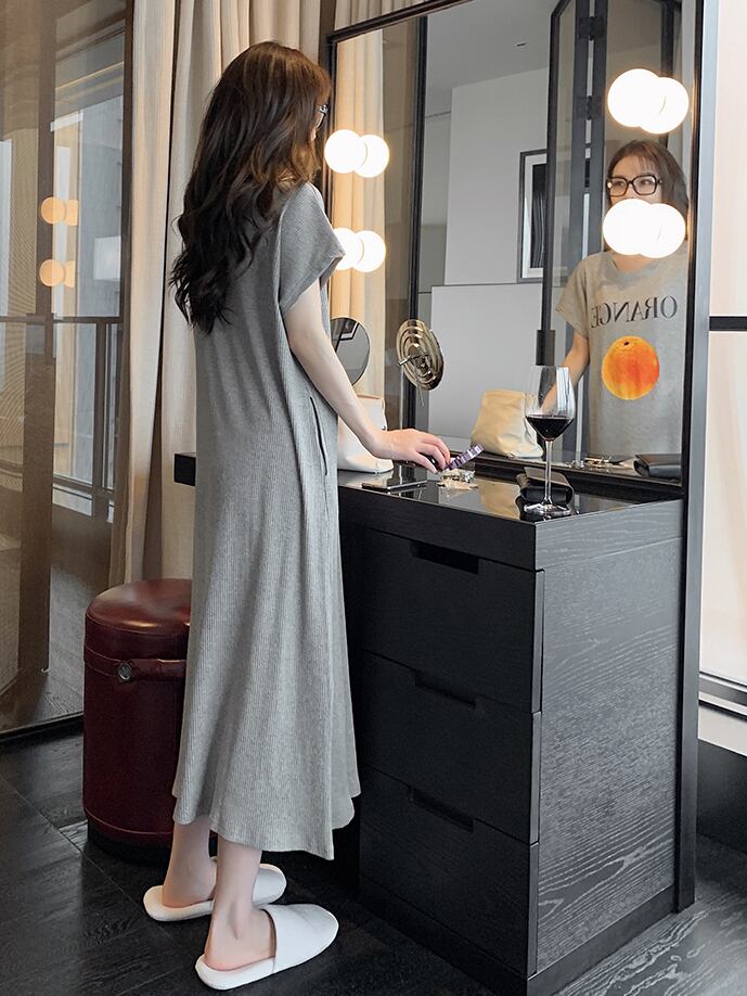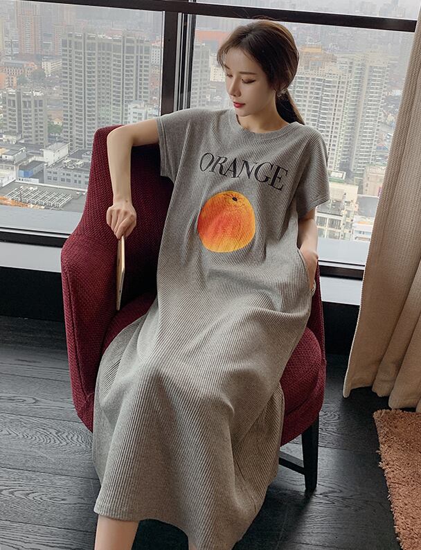 ルームウェア パジャマ 部屋着 ナイトウェア ワンピース ロング丈 半袖 ラウンドネック モダール かわいい シンプル カジュアル ラフ ラブリー キュート ゆったり フルーツ 夏 10代 20代 レディース 女性用 OL 学生 お泊まり 休日 楽ちん リラックス ブルー グレー イエロー ピンク