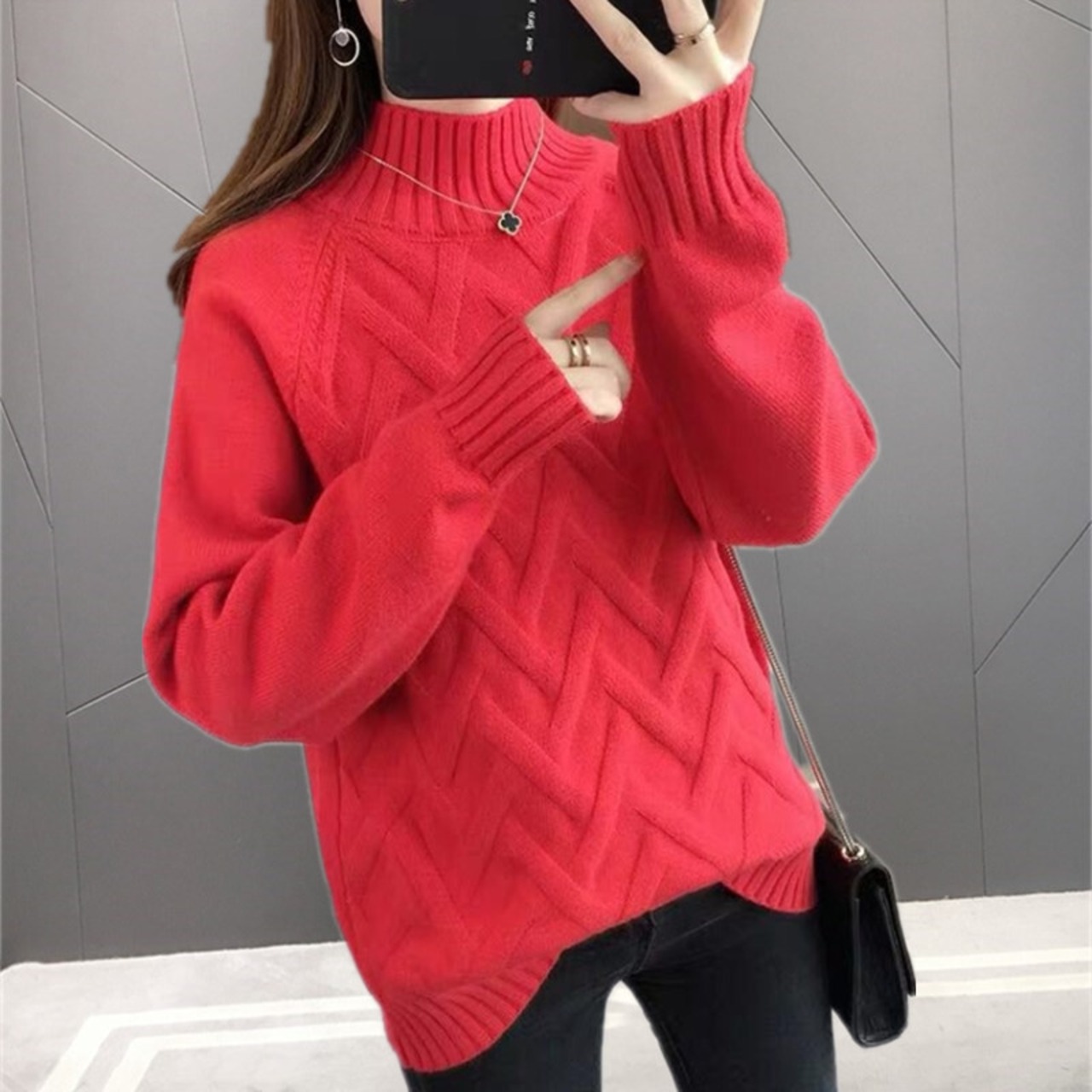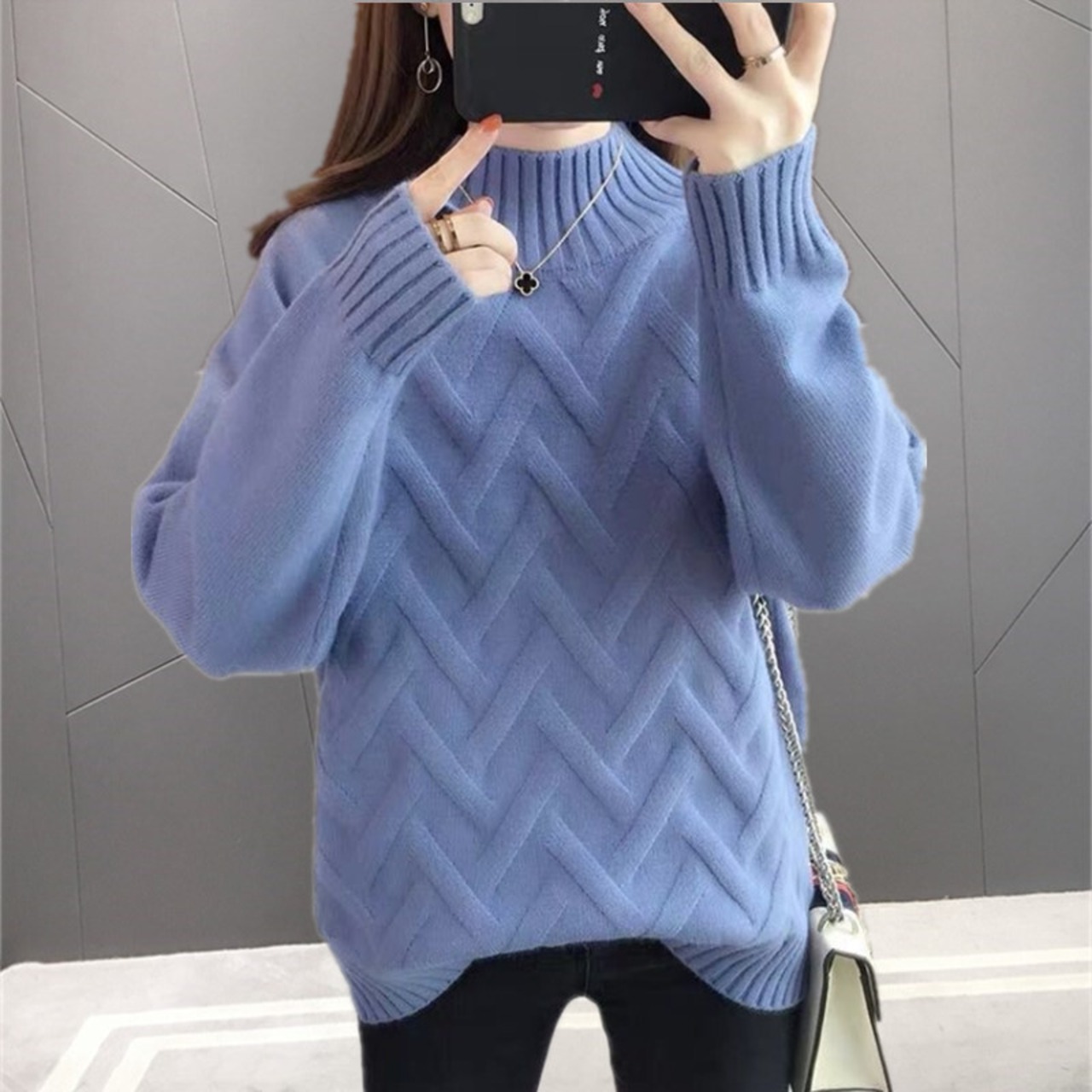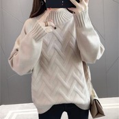 ヘリンボーンのような柄がお洒落なハイネックニット。