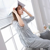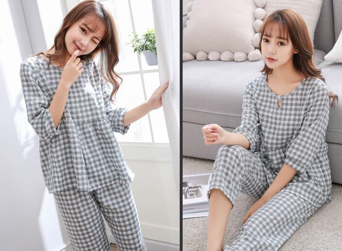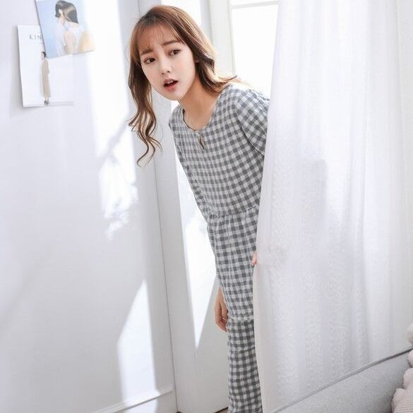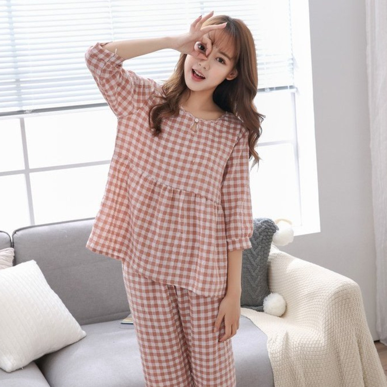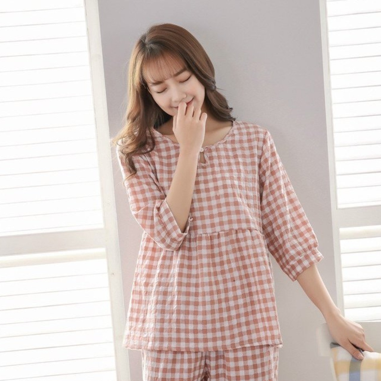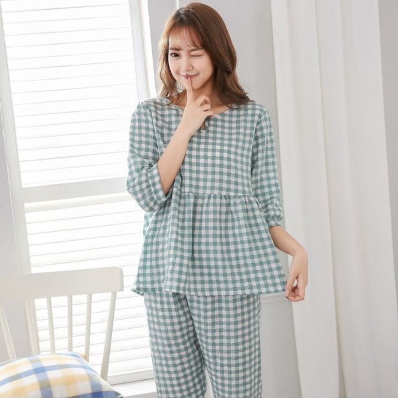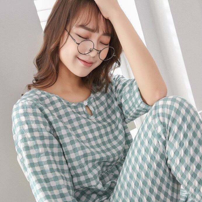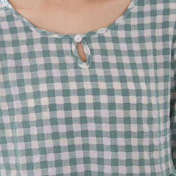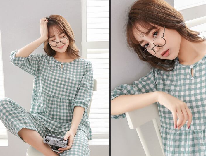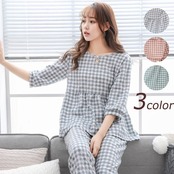 ルームウェア パジャマ 寝巻き ナイトウェア 7分袖 ラウンドネック ティアドロップ ウエストゴム かわいい 大人可愛い シンプル カジュアル ラフ ラブリー キュート ナチュラル ギンガムチェック 夏 10代 20代 30代 レディース 女性用 OL 学生 お泊まり 休日 リラックス 定番 グリーン オレンジ モスグレー