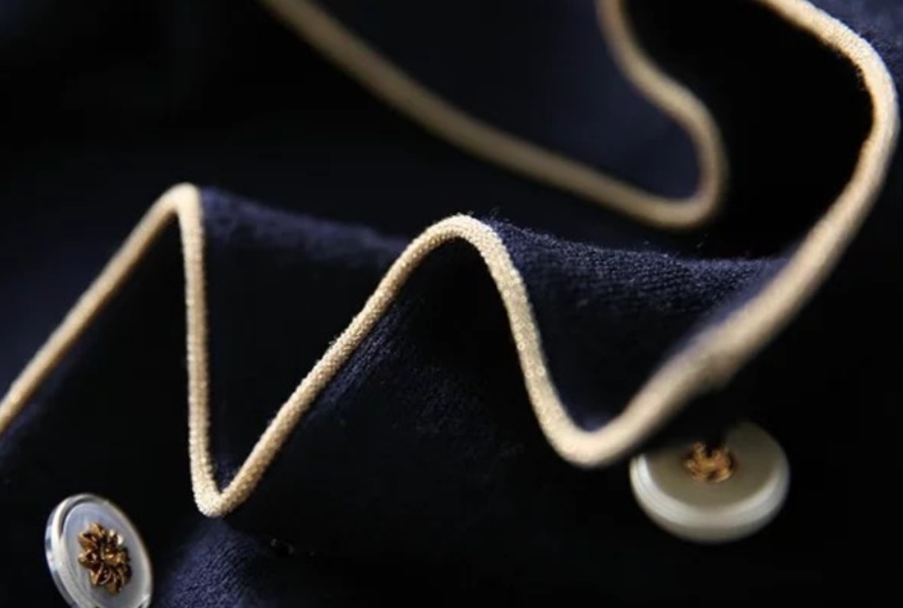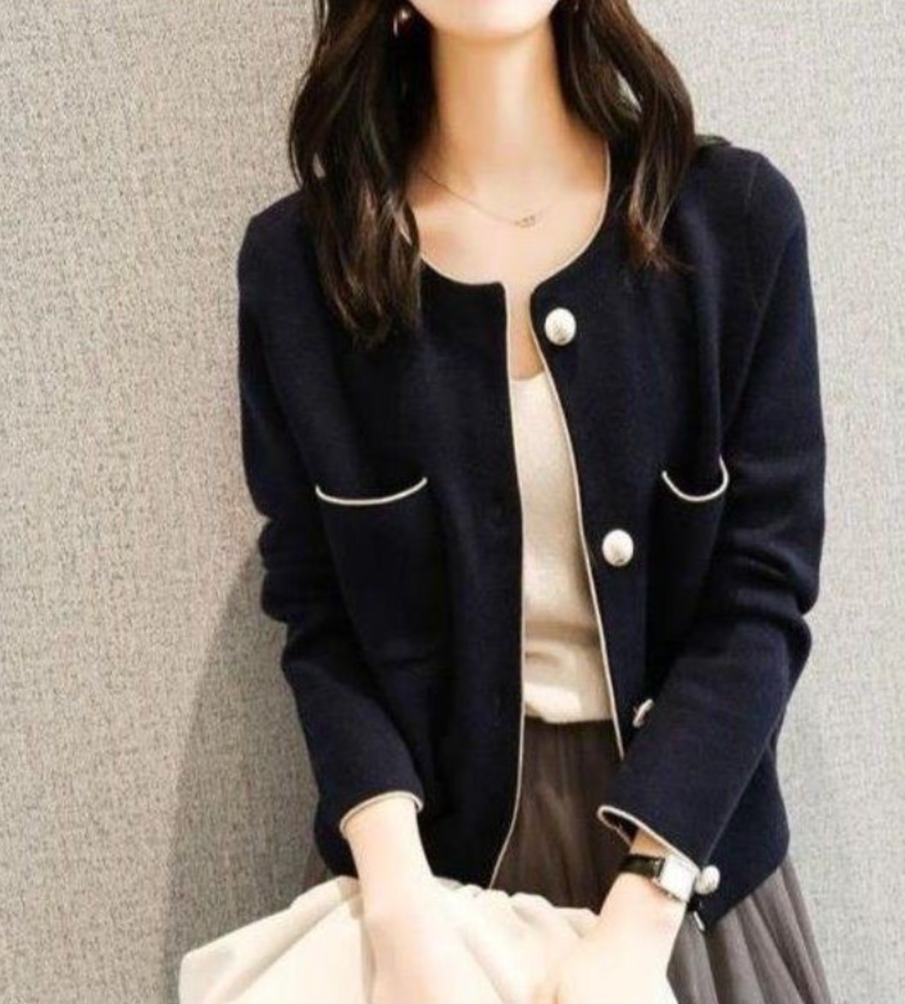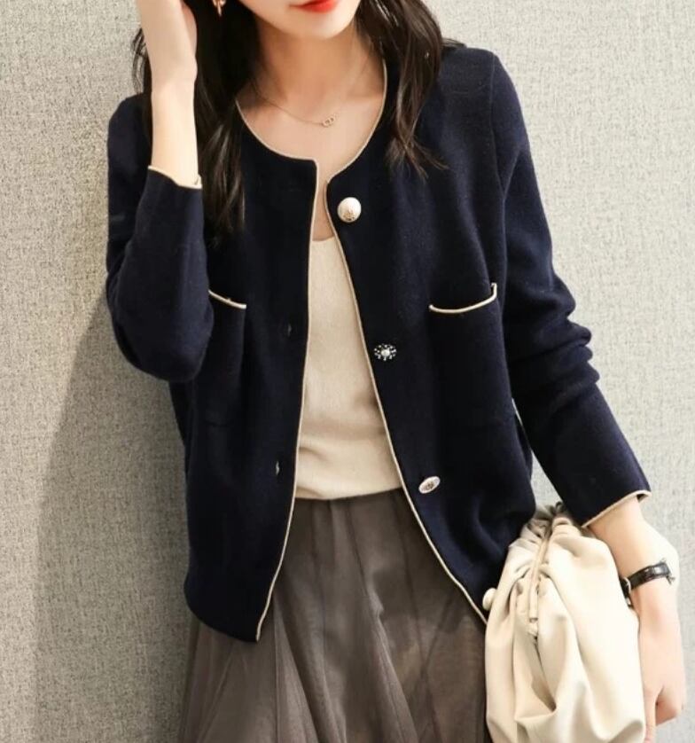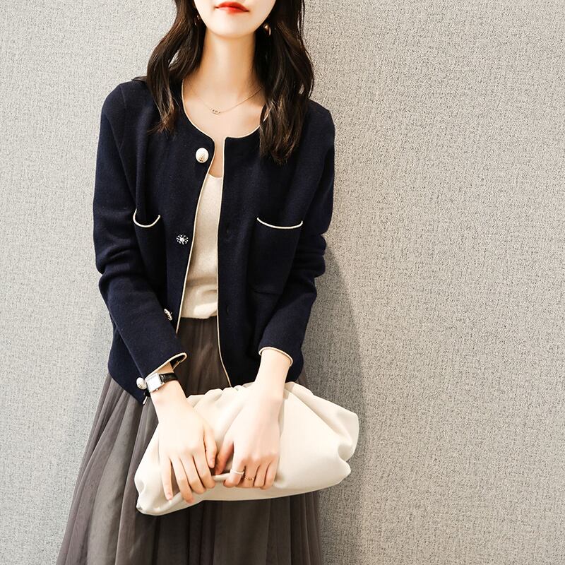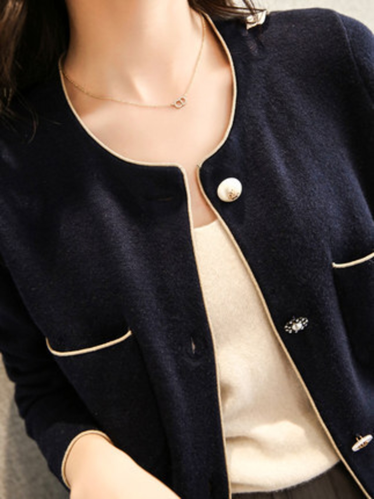 首周りや袖に施されたさりげない縁取りとキラリと光るパールボタンが上品さを演出します。