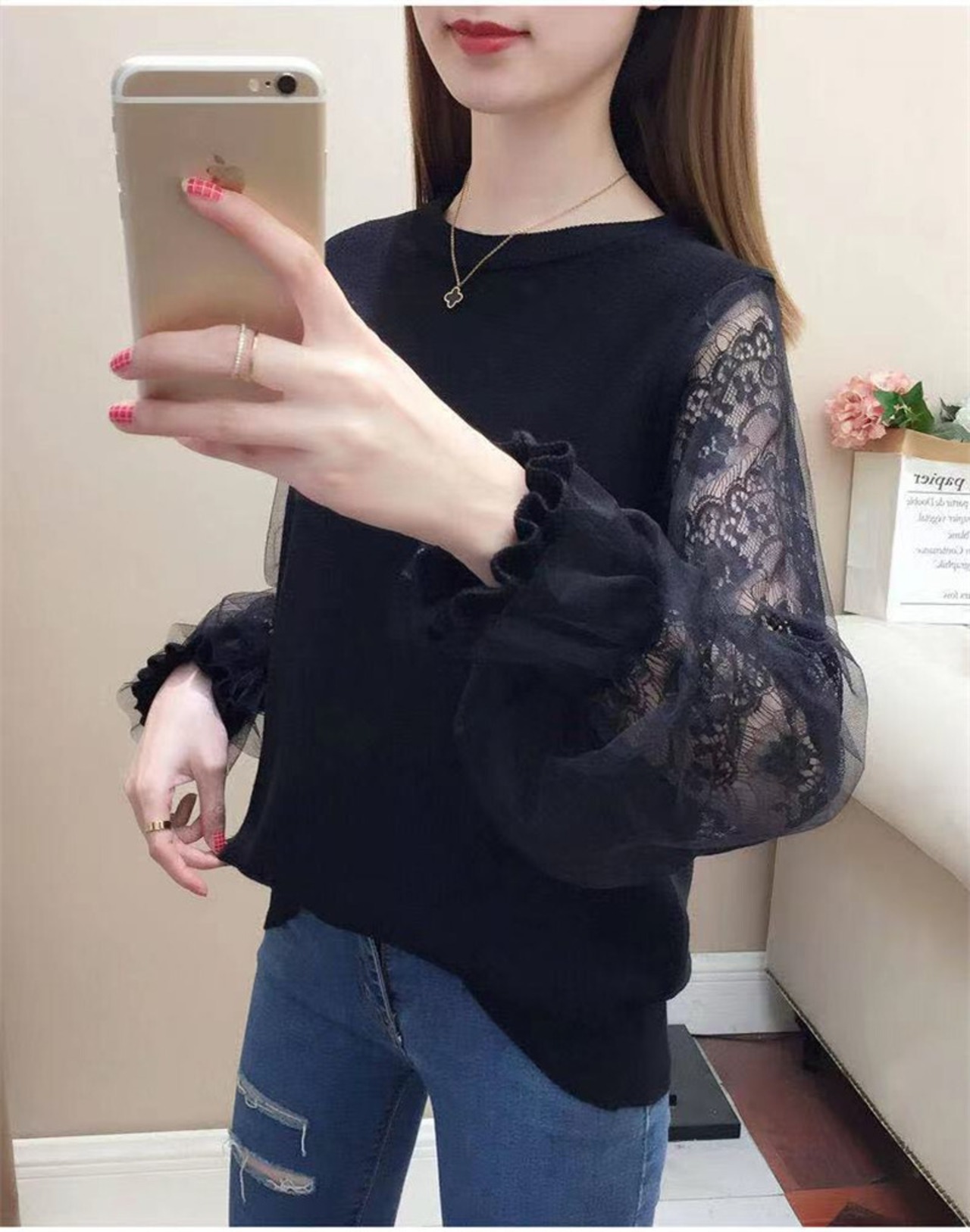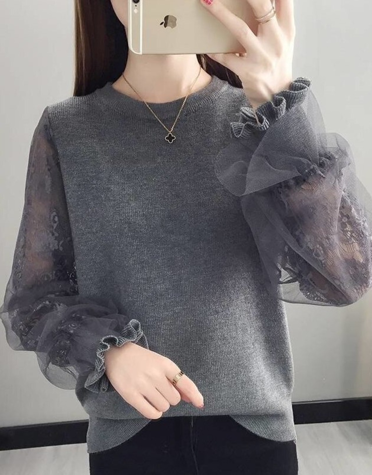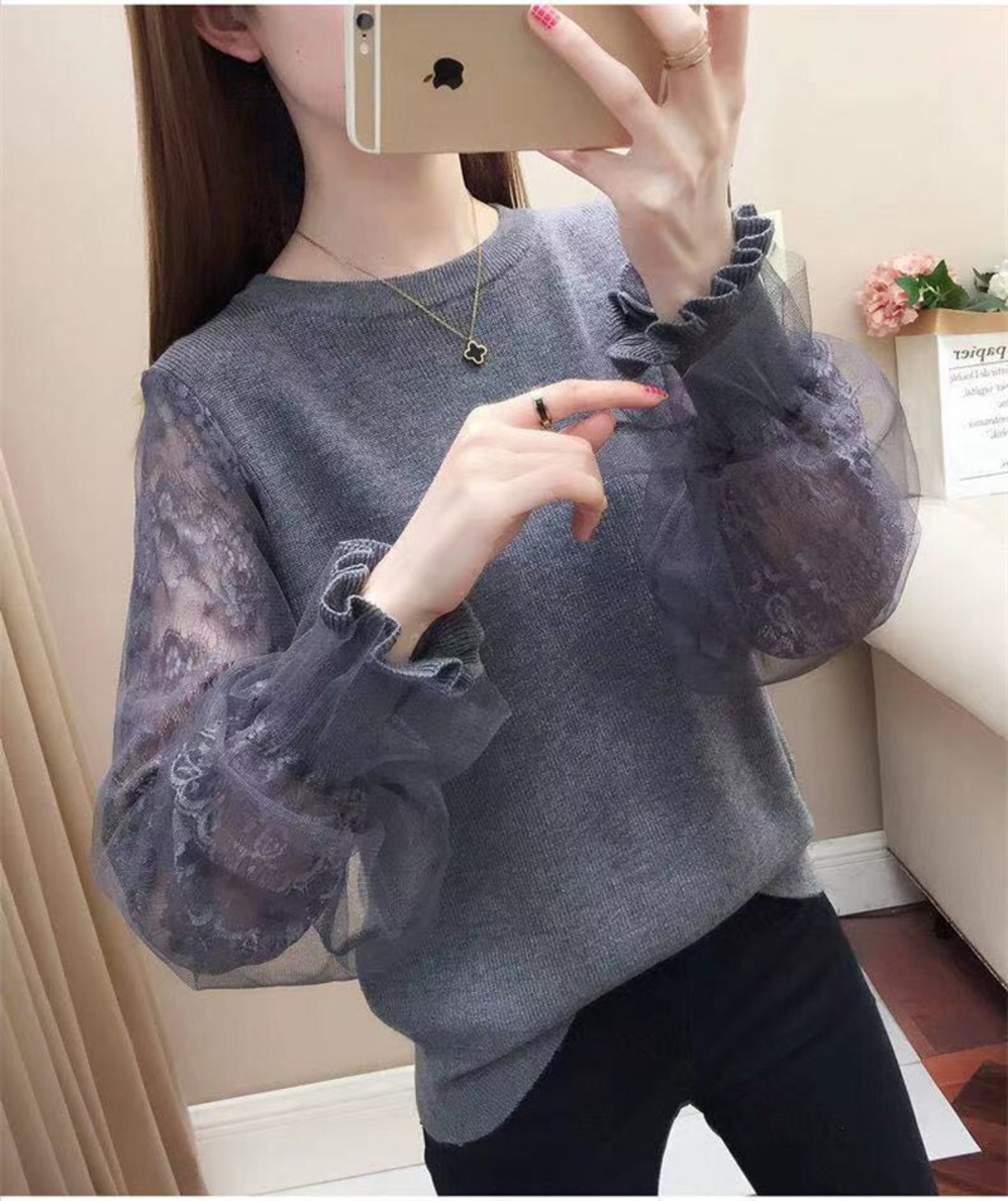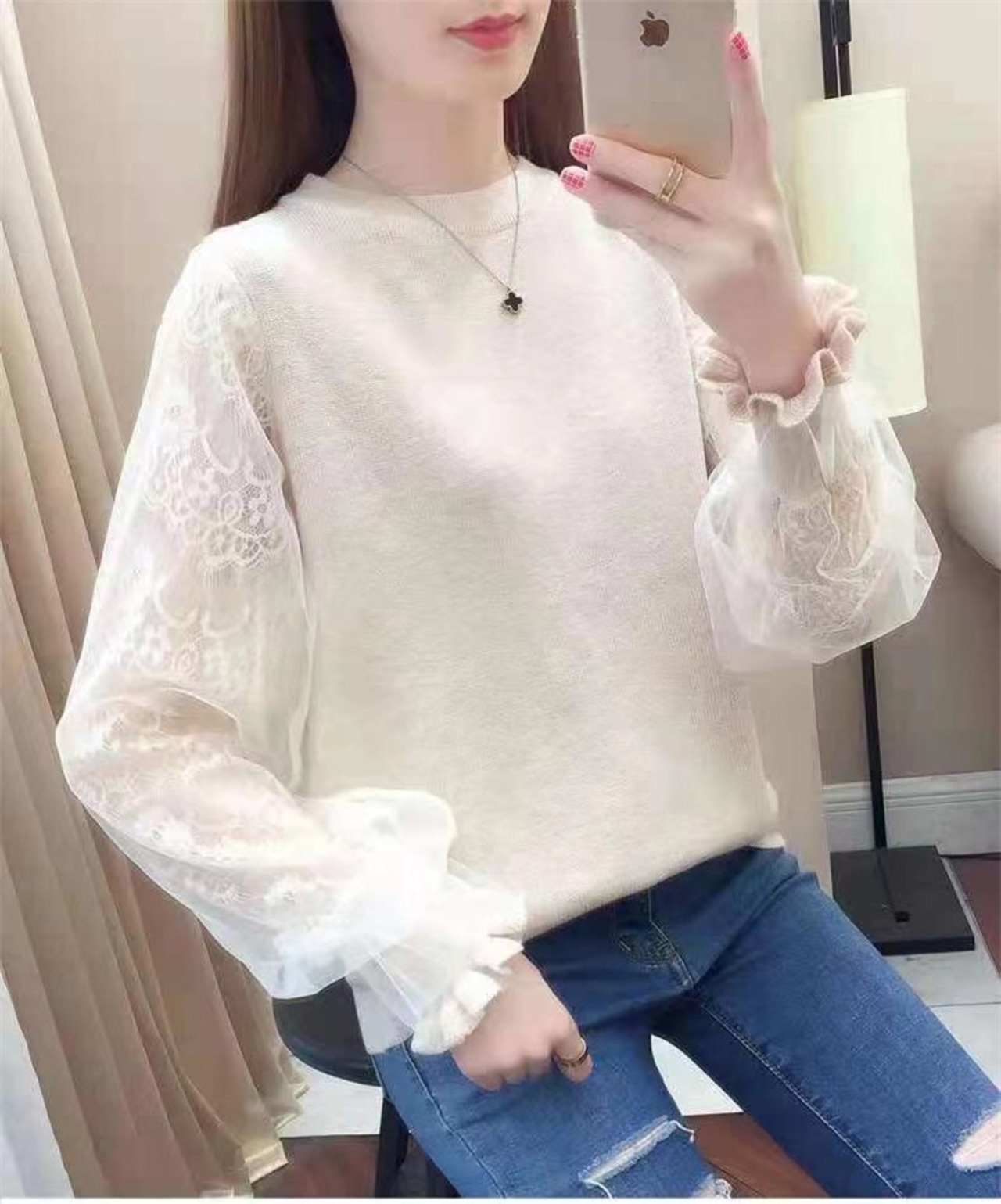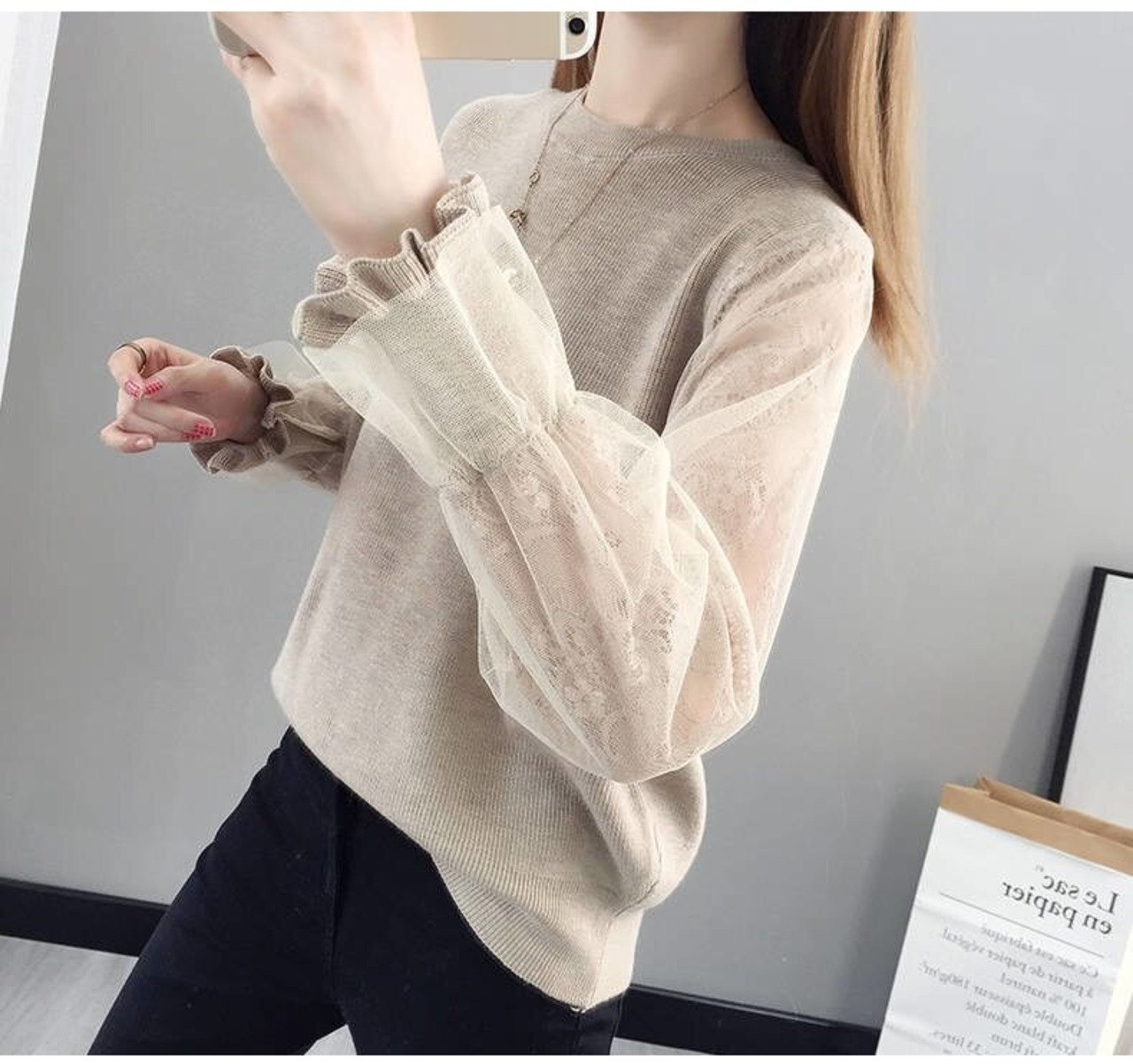 袖にレースを使用した華やかな印象のトップスはこれからの時期に大活躍の予感。