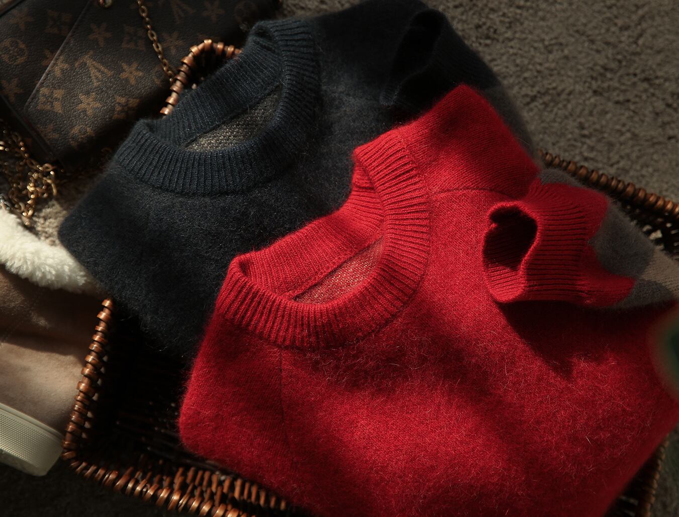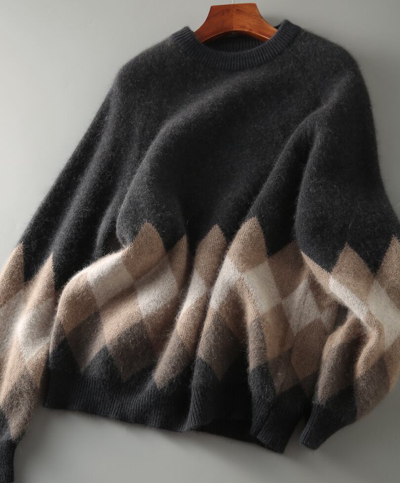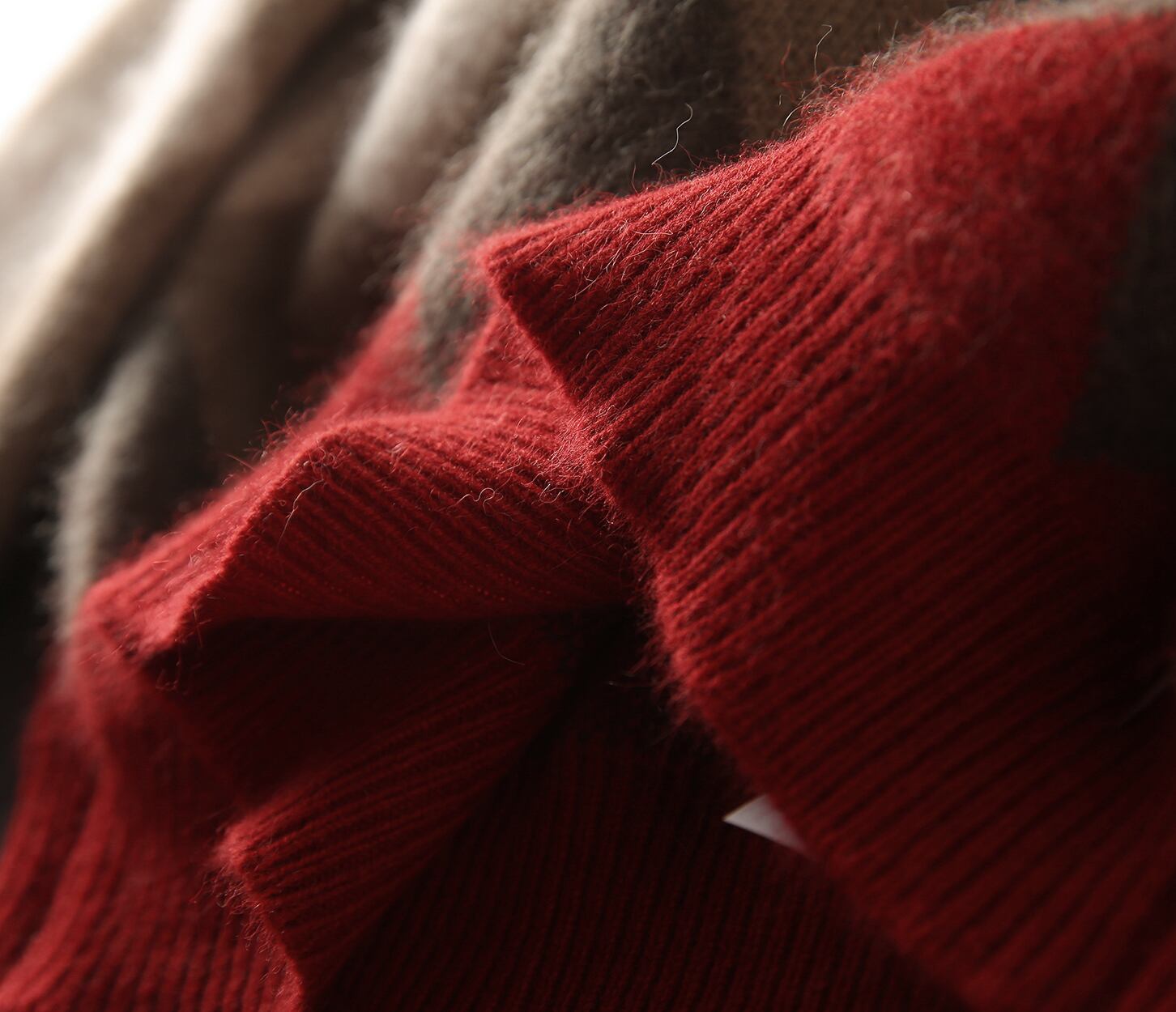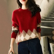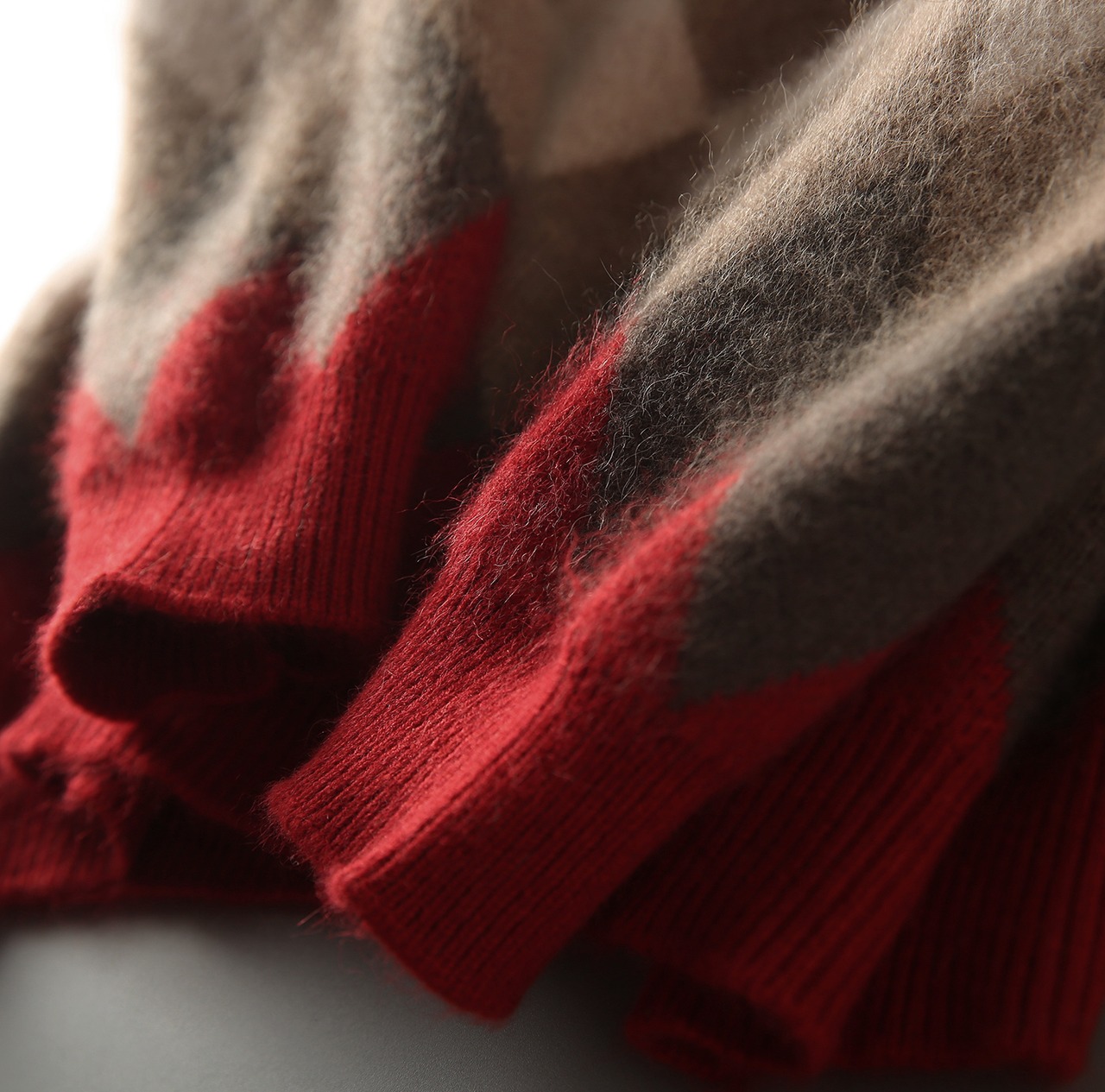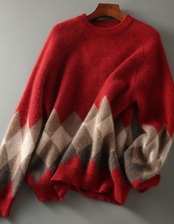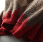 落ち着いたレッドとグレーのニット生地の裾に施されたアーガイル柄もポイント♪
