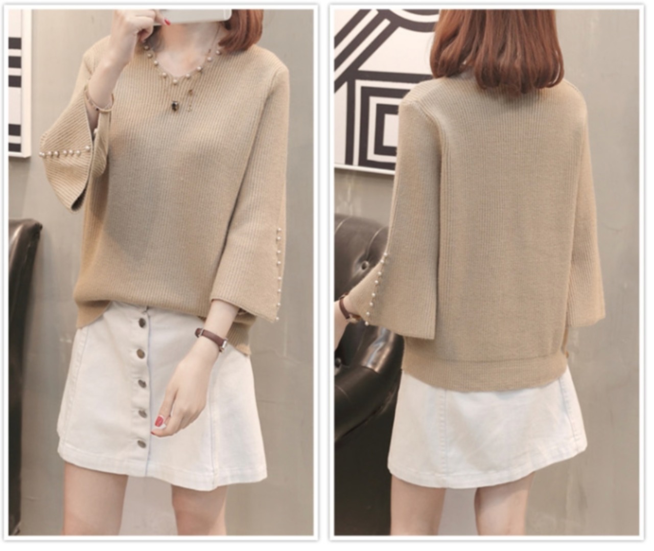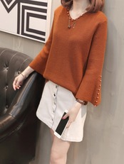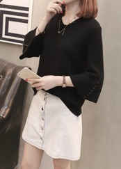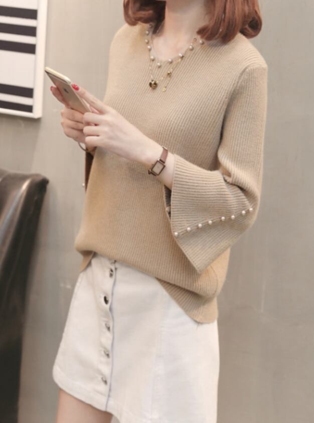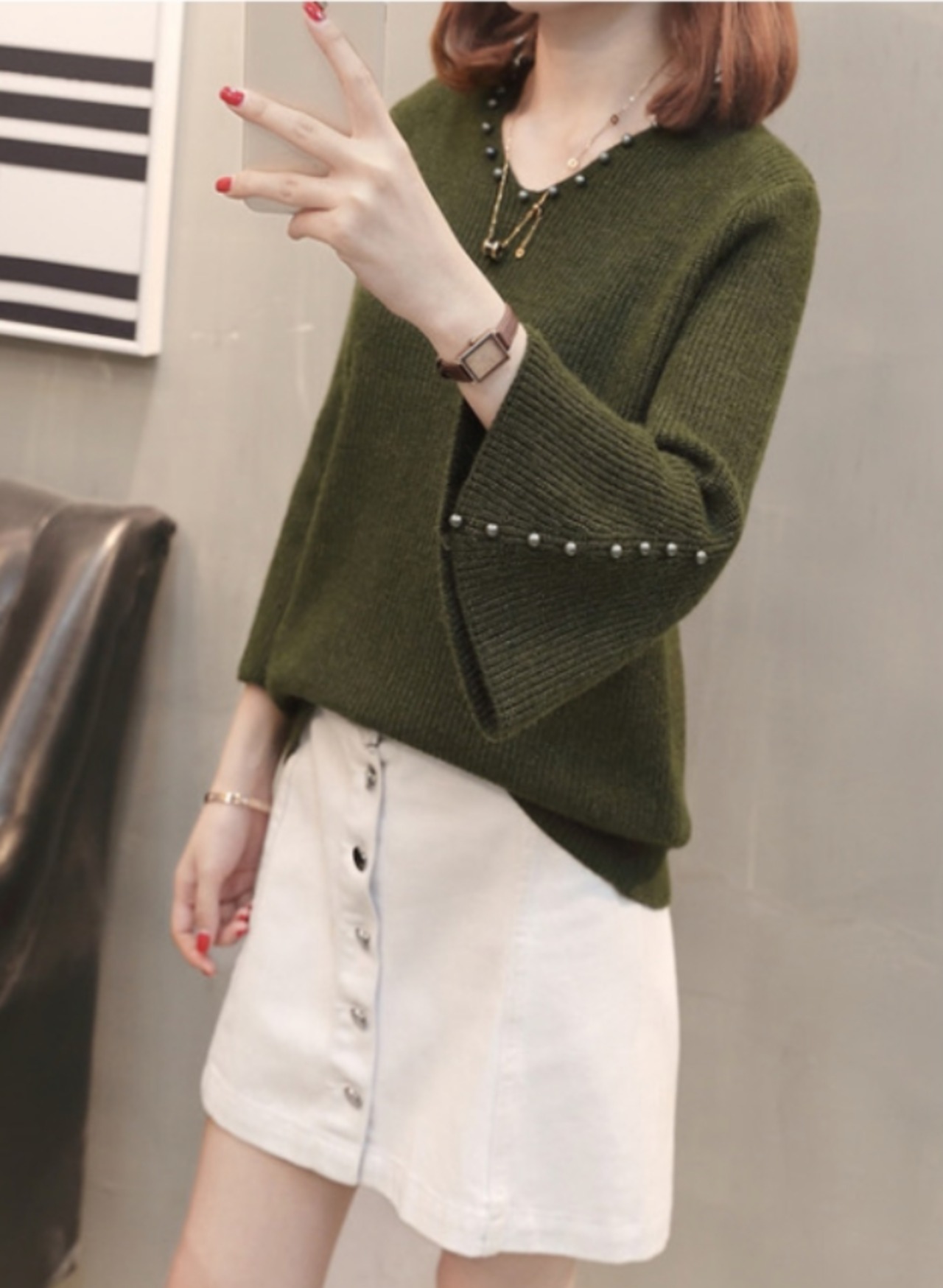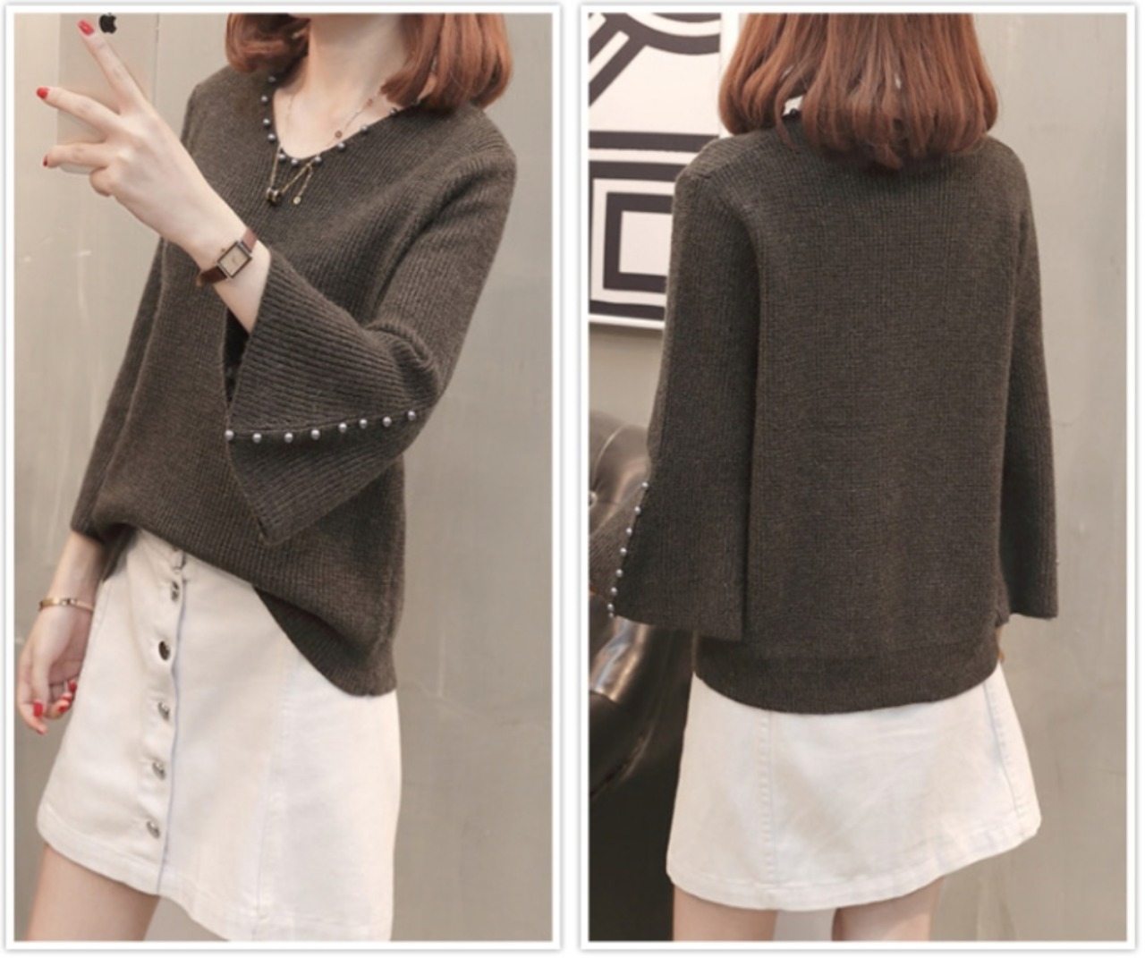 袖口がふんわり広がるフレアスリーブと首元のVネックカットでフェミニン度が急上昇!