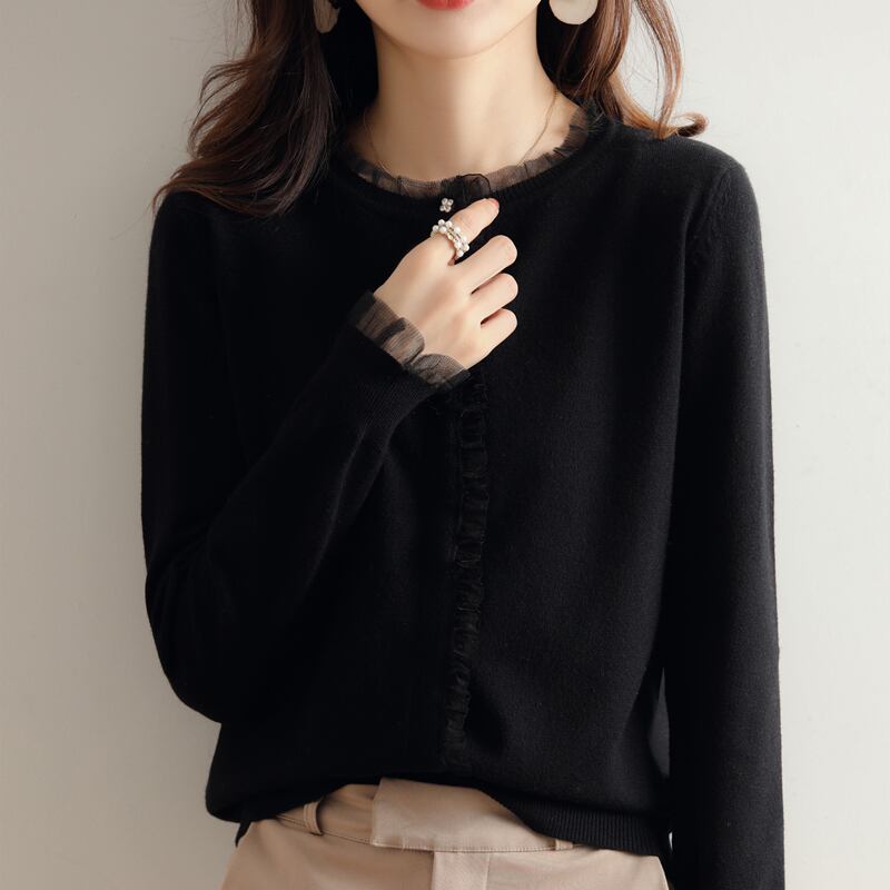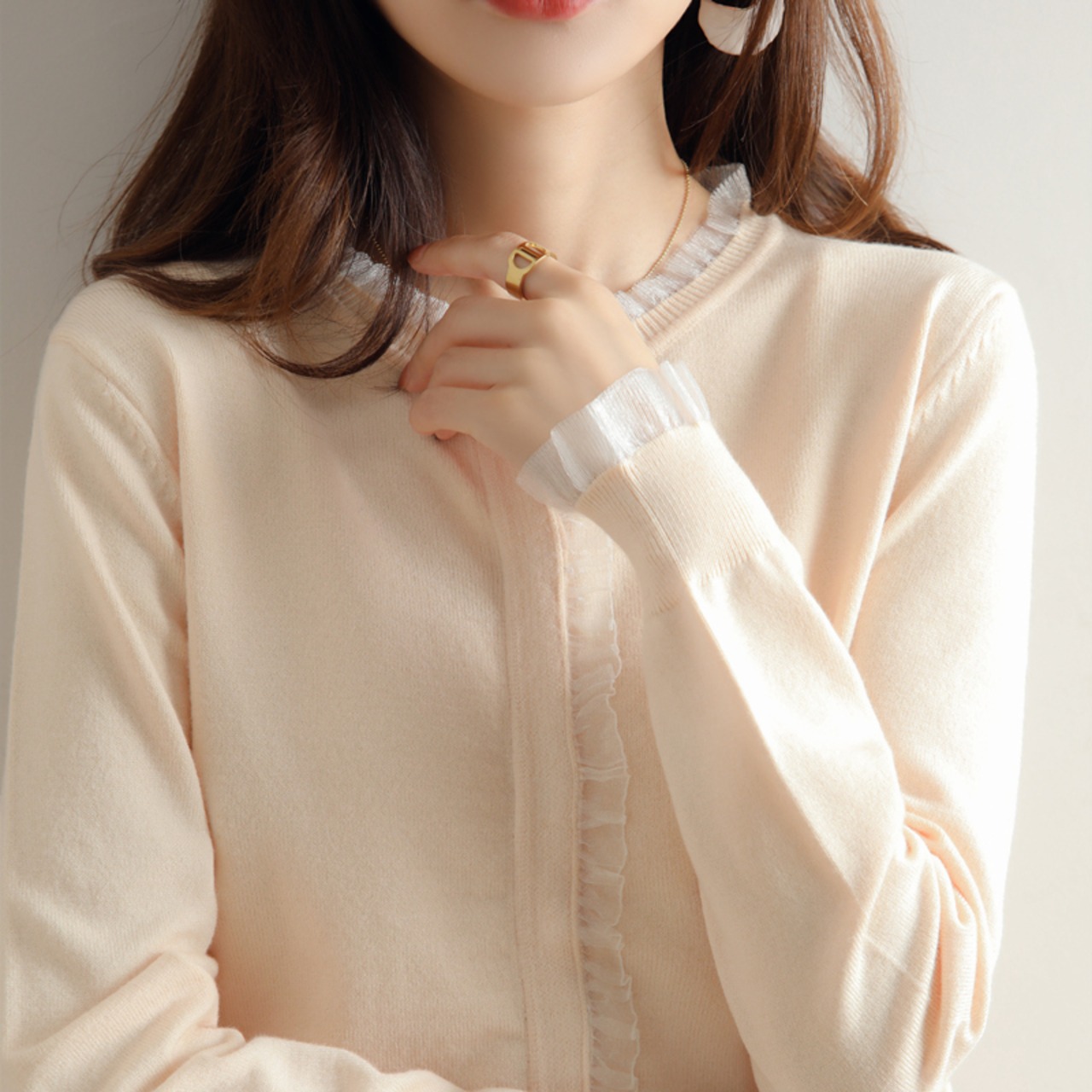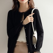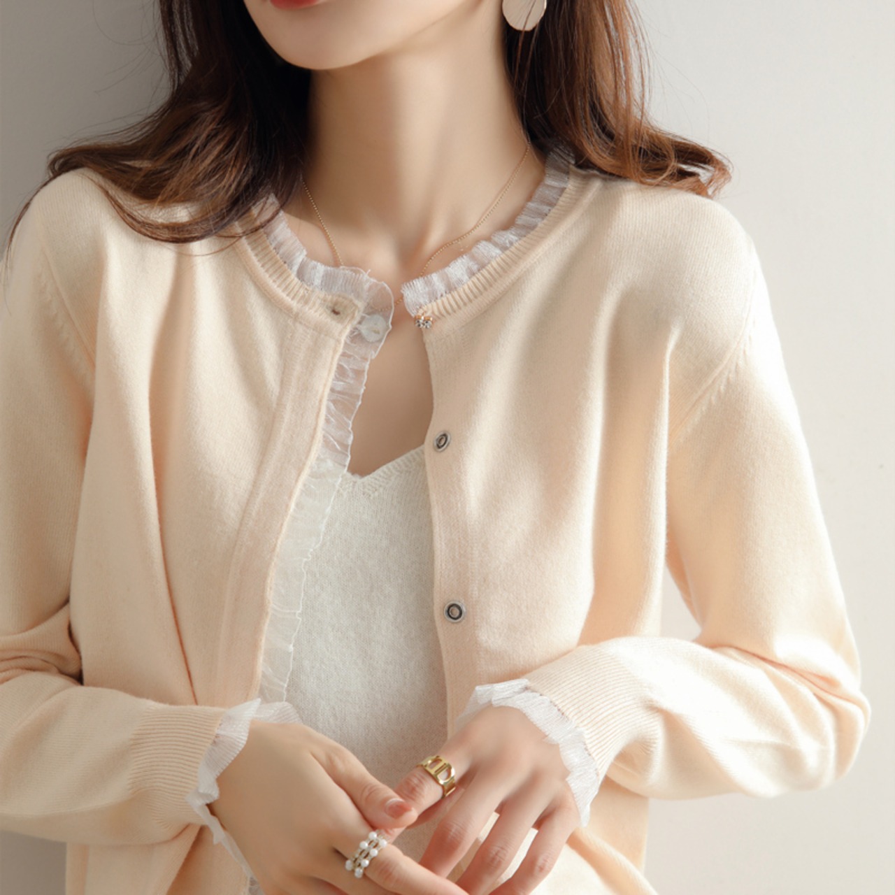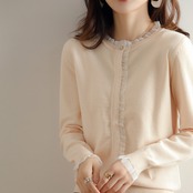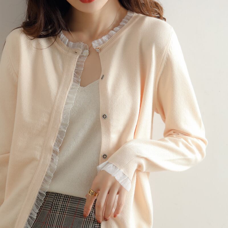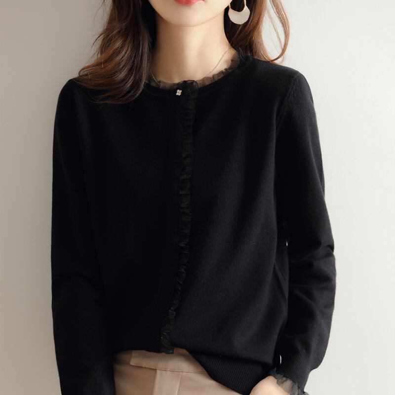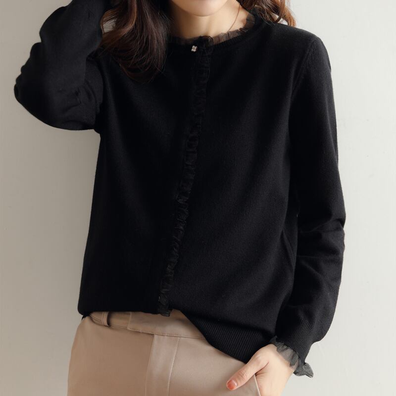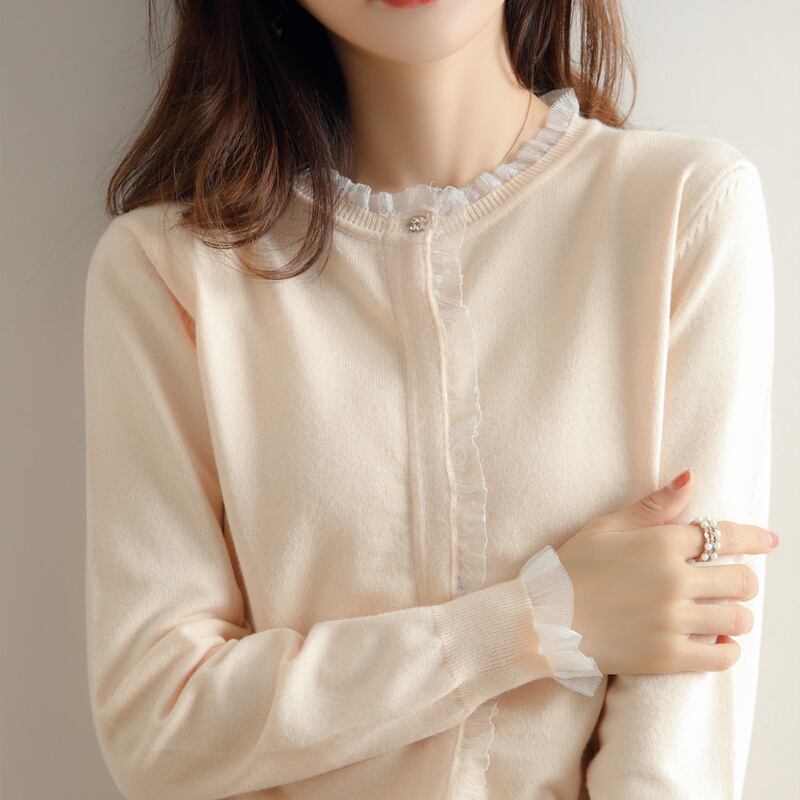 トップス カーディガン 袖あり 長袖 クルーネック スリム 細身 ストレート Iライン チュール フリル 前開き 伸縮性 ウール かわいい きれいめ シンプル カジュアル 上品 おしゃれ お洒落 大人女子 こなれ感 ラブリー キュート ガーリー エレガント 無地 春 秋 10代 20代 レディース オフィス OL 学生 通学 デート お出かけ 女子会 休日 着回し 普段使い 重ね着 モテ S M L XL ブラック 春カラー アプリコット