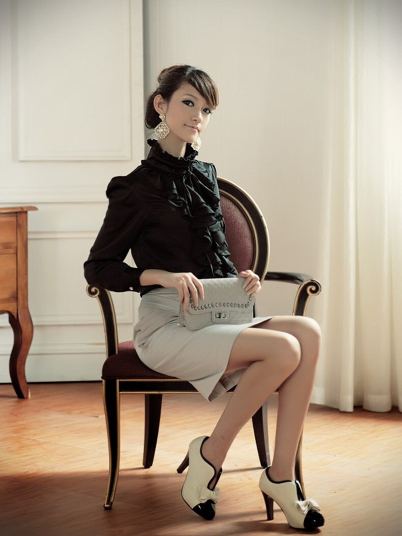 パワーショルダーがフェミニンなシルエットで上品な印象を与えます。