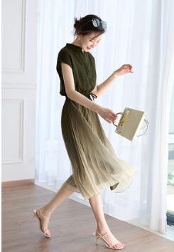 プリーツワンピース トップス シンプル アーミーグリーン ミドル丈 袖なし ノースリーブ リボンタイ フレア 大人女子 大人 上品 おしゃれ エレガント デイリーウェア レトロ レトロ風 こなれ感 個性的 デザイン 主役級 存在感 無地 ボタニカル 夏 サマー 20代 10代 30代 40代 レディース 女性用 オフィス ビジネス OL 通勤 学生 学校 通学 デート お出かけ 女子会 食事会 着回し 普段使い ファッション コーデ 細見え S M L XL 2XL