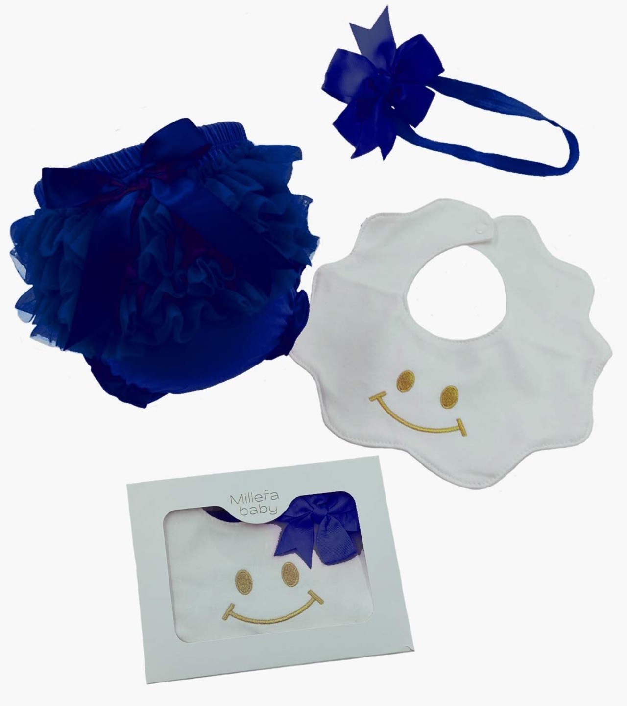 Millefa Baby ギフトBOX付き!ベビー 女の子 ギフト3点セット(フリルブルマ・スタイ・ヘアバンド)【ブルー】