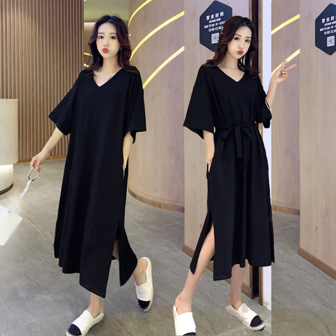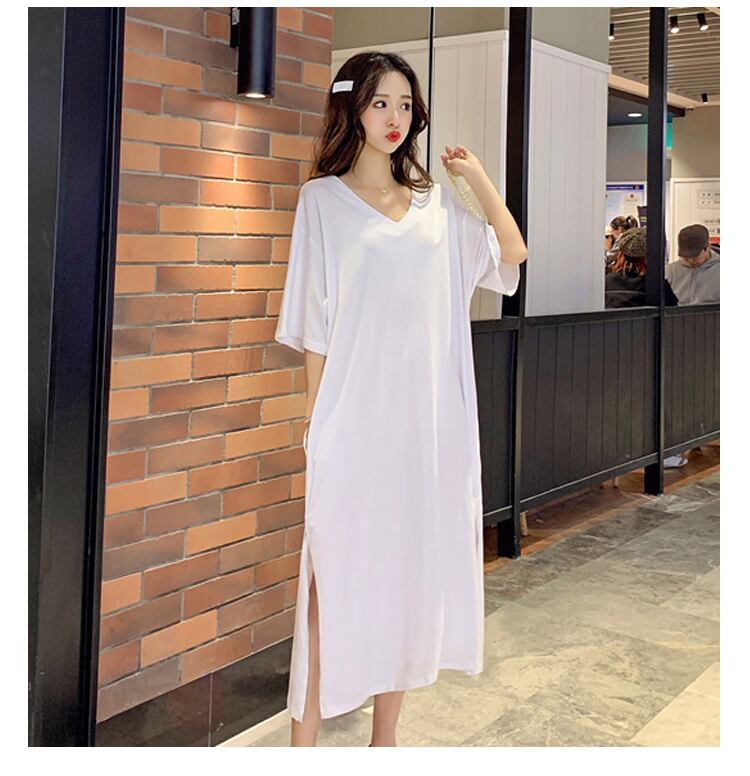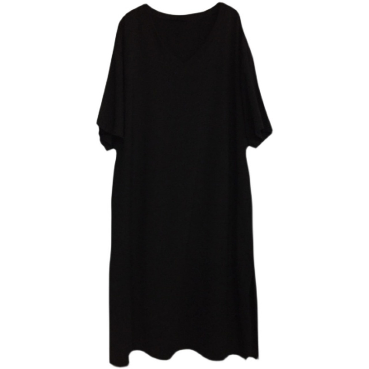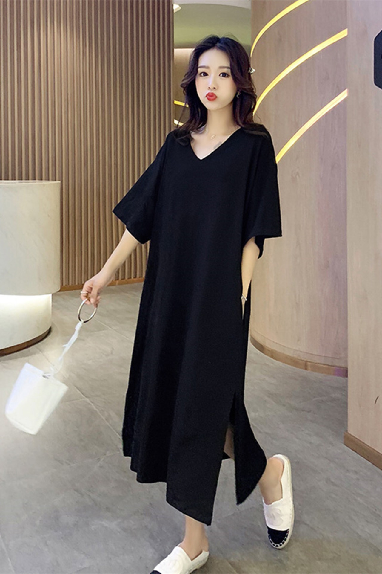 Tシャツワンピース トップス シンプル ブラック 黒 ホワイト 白 ミドル丈 ロング丈 袖あり 半袖 Vネック ワイド スリット 綿 コットン 大人女子 大人 上品 おしゃれ デイリーウェア レトロ レトロ風 こなれ感 ルーズ シルエット ラフ 主役級 存在感 無地 夏 サマー 20代 10代 30代 40代 レディース 女性用 マタニティ 学生 学校 通学 休日 おうち らくちん 着回し 普段使い ファッション コーデ L XL 2XL 大きいサイズ