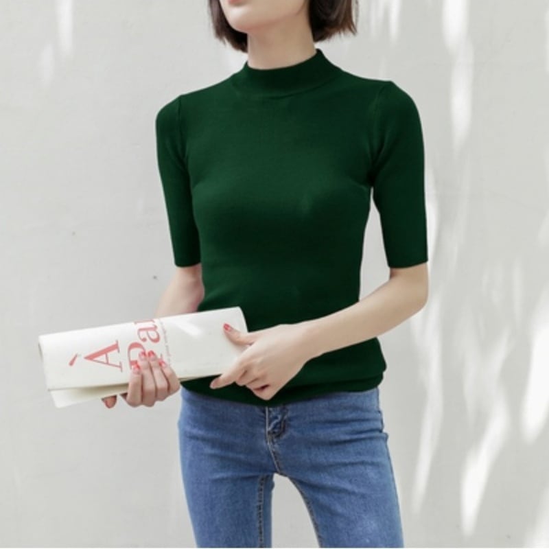 トップス Tシャツ カットソー ニットソー プルオーバー 袖あり 半袖 5分袖 五分袖 ハイネック スリム タイト 伸縮性 かわいい きれいめ シンプル カジュアル 大人 上品 おしゃれ お洒落 大人女子 こなれ感 フェミニン 無地 春 夏 10代 20代 30代 レディース オフィス OL 通勤 学生 通学 デート お出かけ 女子会 休日 着回し 普段使い 重ね着 お揃い 楽ちん モテ S M L XL 2XL 10色展開 カラバリ