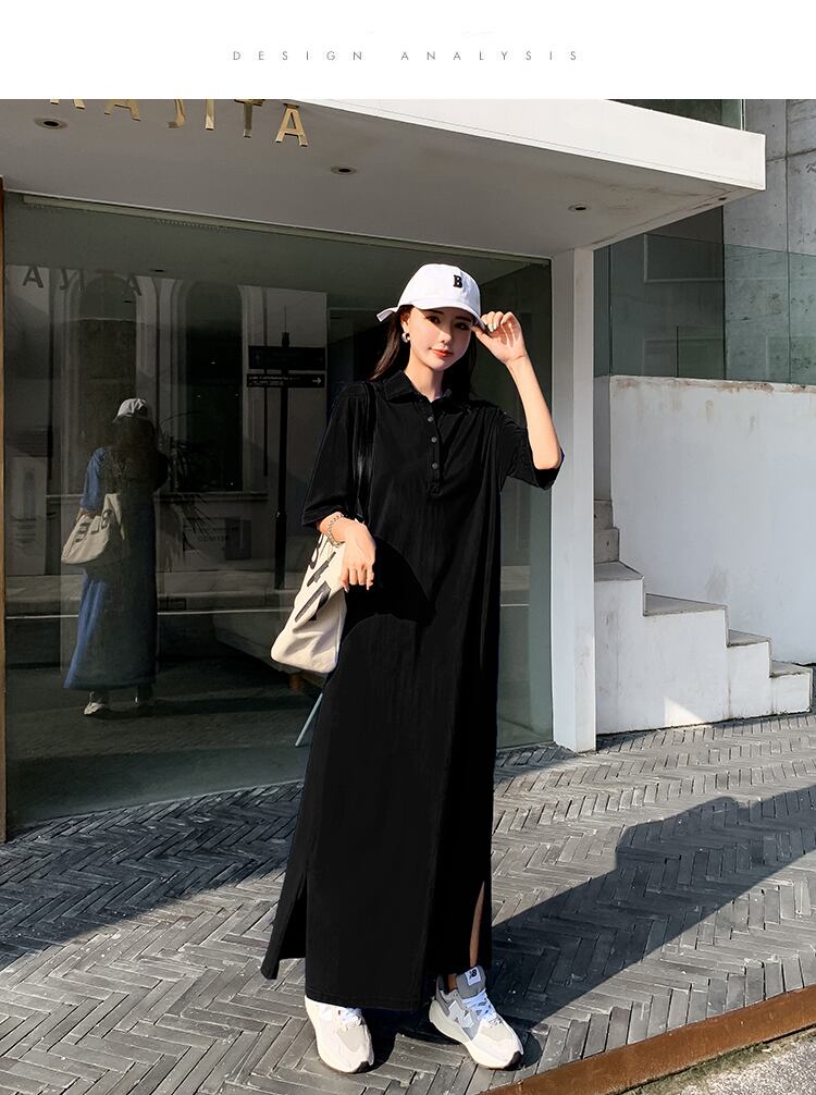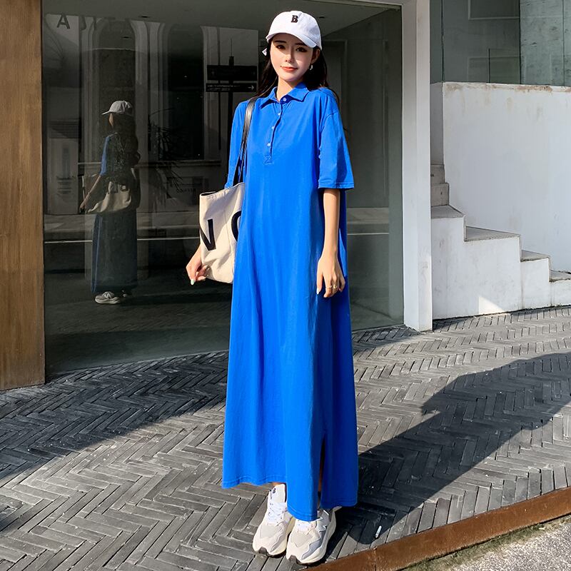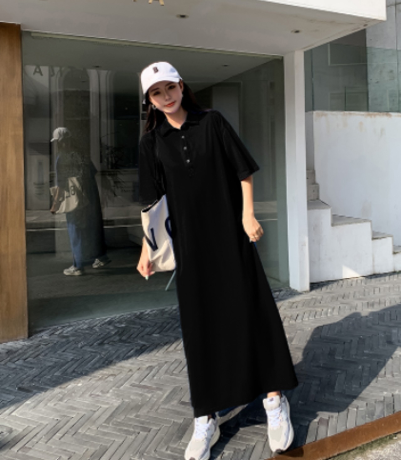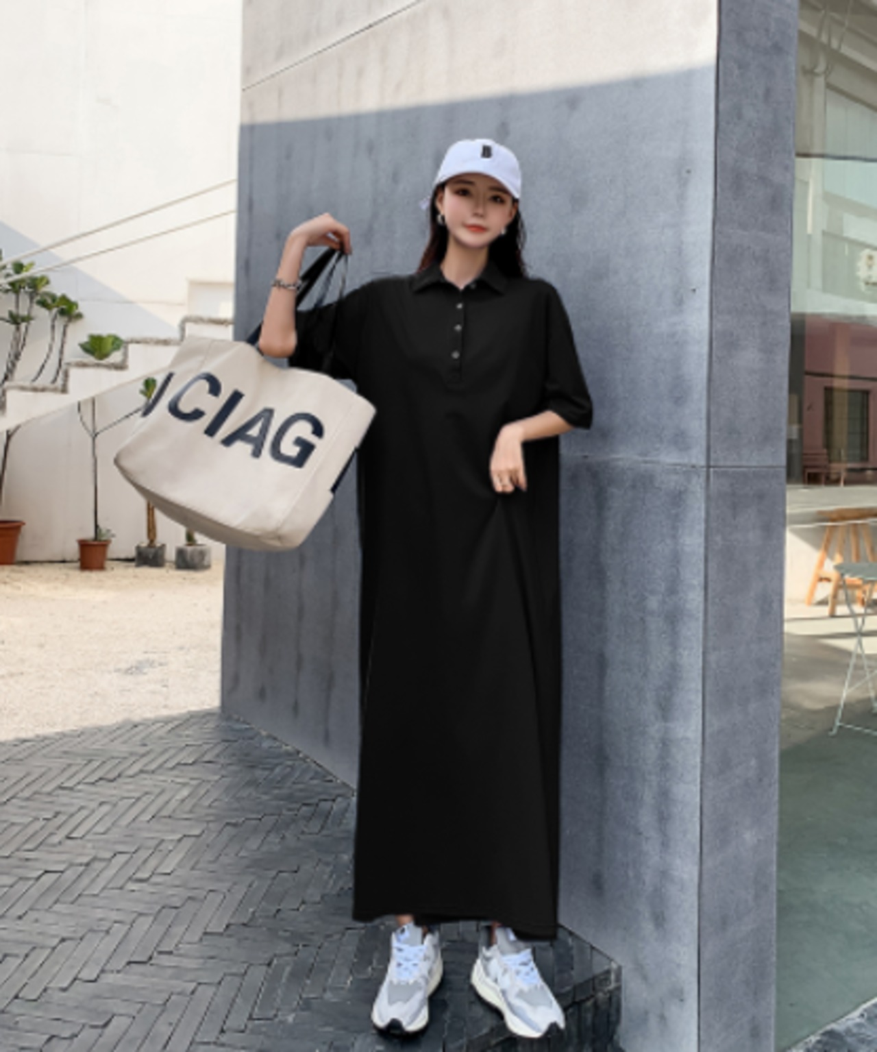 ポロカラーワンピース トップス ワンピース プルオーバー シンプル ブラック 黒 ブルー 青 オレンジ ロング丈 袖あり 半袖 襟付き ワイド ボタン 綿 コットン 大人女子 大人 上品 おしゃれ デイリーウェア レトロ レトロ風 こなれ感 ルーズ シルエット ラフ 個性的 デザイン 主役級 存在感 無地 夏 サマー 20代 10代 30代 レディース 女性用 学生 学校 通学 休日 おうち らくちん 着回し 普段使い 定番 L XL 2XL 3XL 大きいサイズ