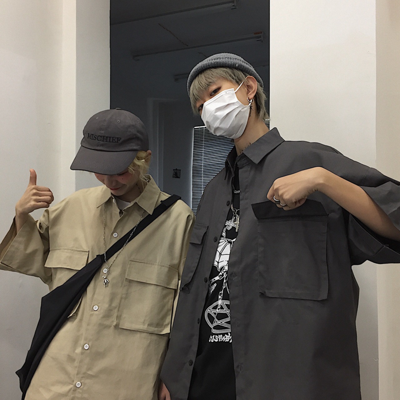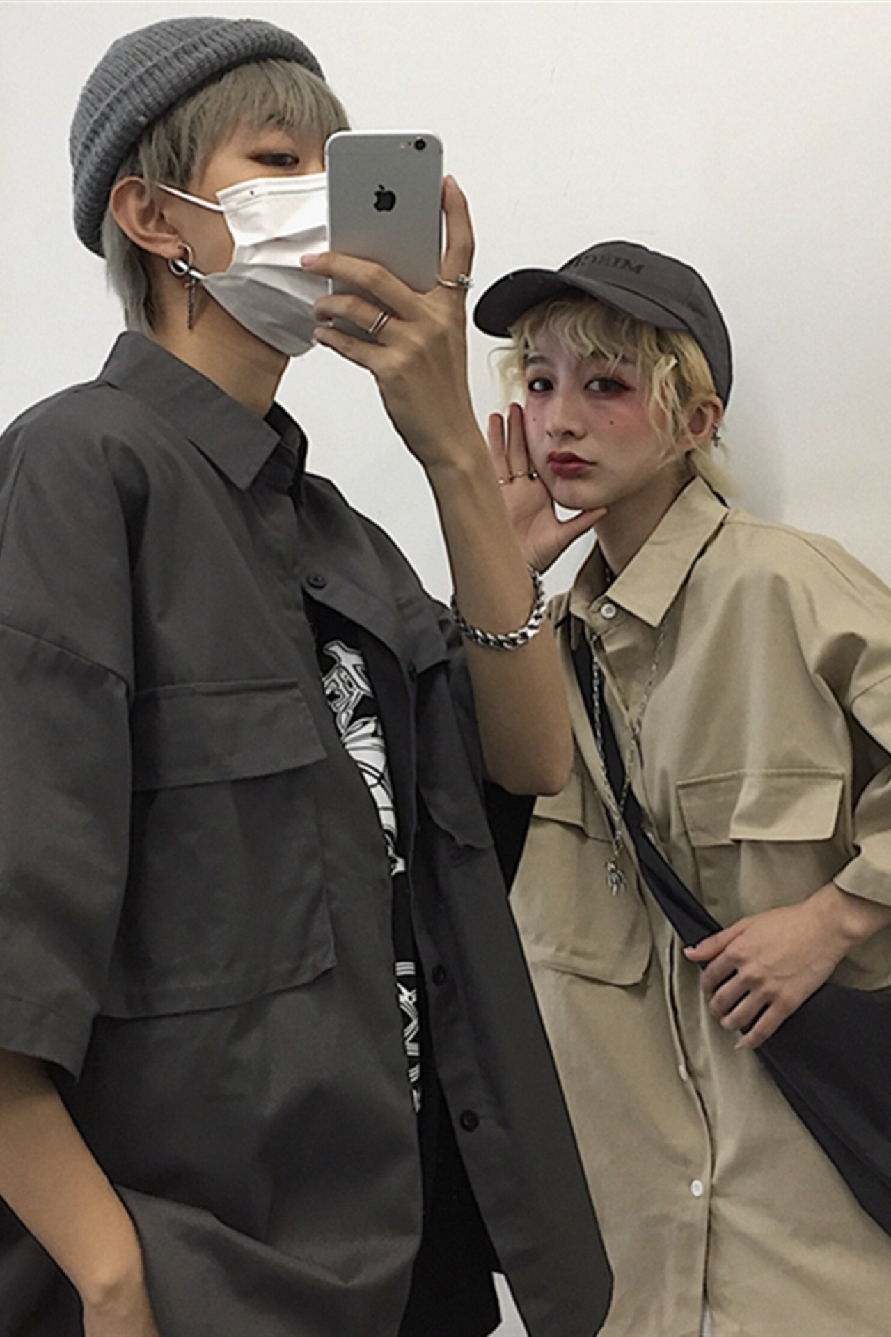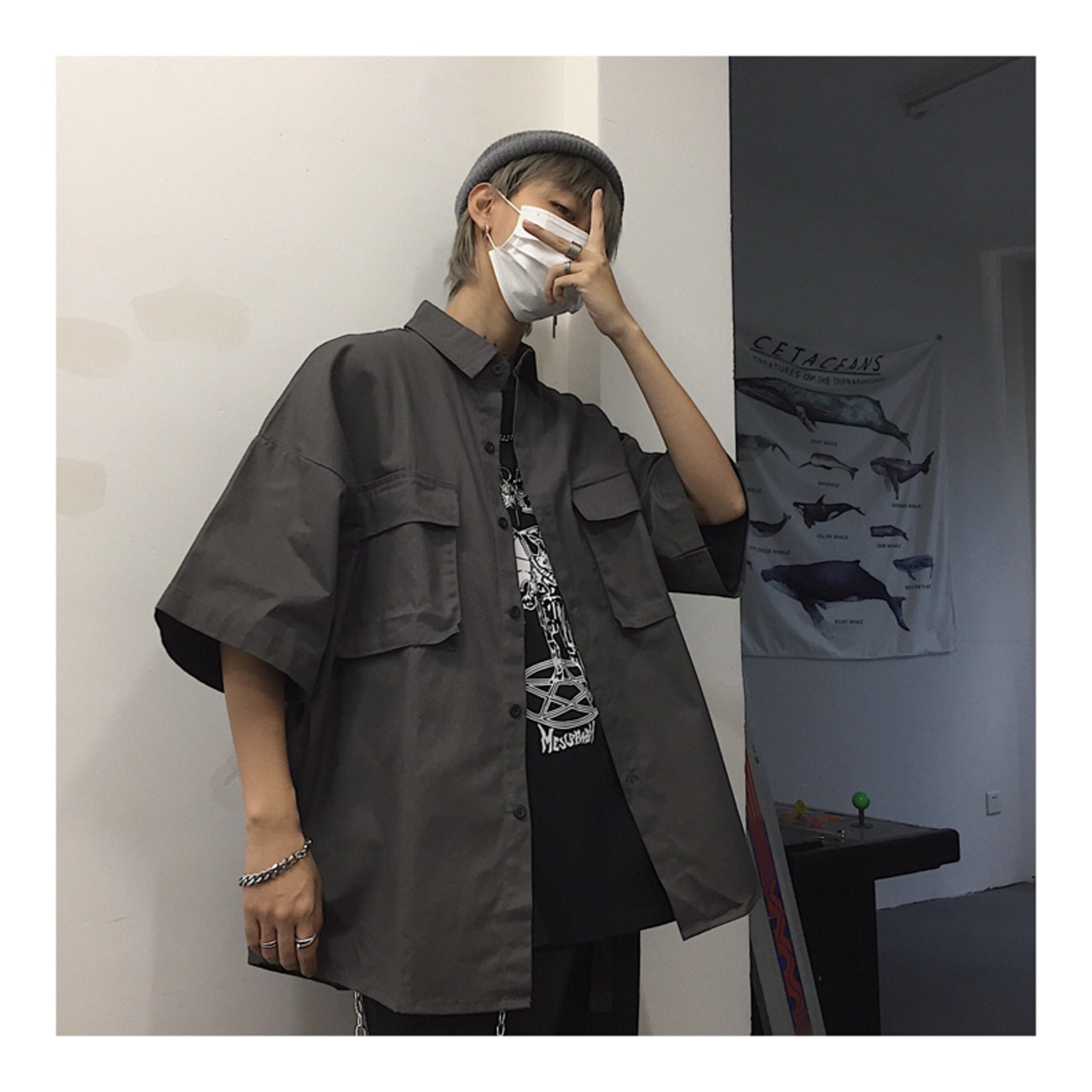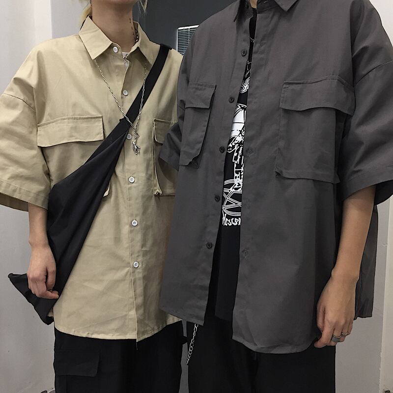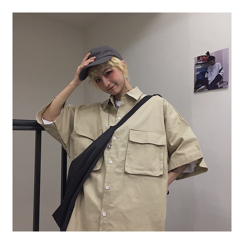 ビッグシャツ トップス シャツ ブラウス ジャケット ストリート カジュアル グレー 灰色 カーキ ミディアム丈 袖あり 半袖 襟付き ストレート ワイド シングルブレスト ボタン ポケット 綿 コットン かっこいい クール デイリーウェア レトロ レトロ風 こなれ感 ルーズ シルエット ラフ 個性的 デザイン 主役級 存在感 無地 夏 サマー 20代 10代 レディース 女性用 メンズ 男性用 男女兼用 ユニセックス 学生 学校 通学 デート お出かけ 女子会 食事会 M L XL