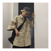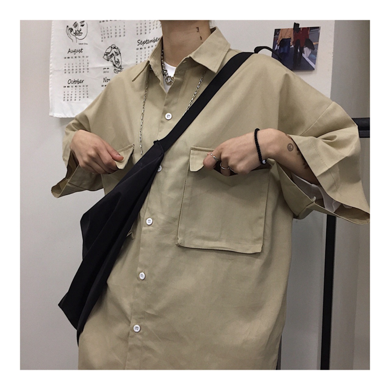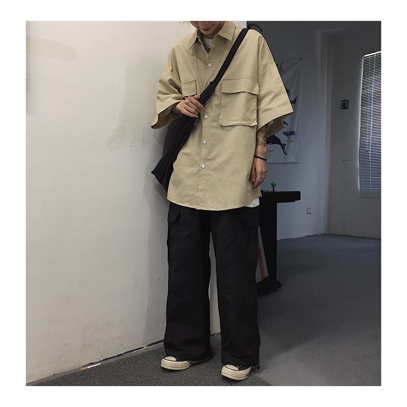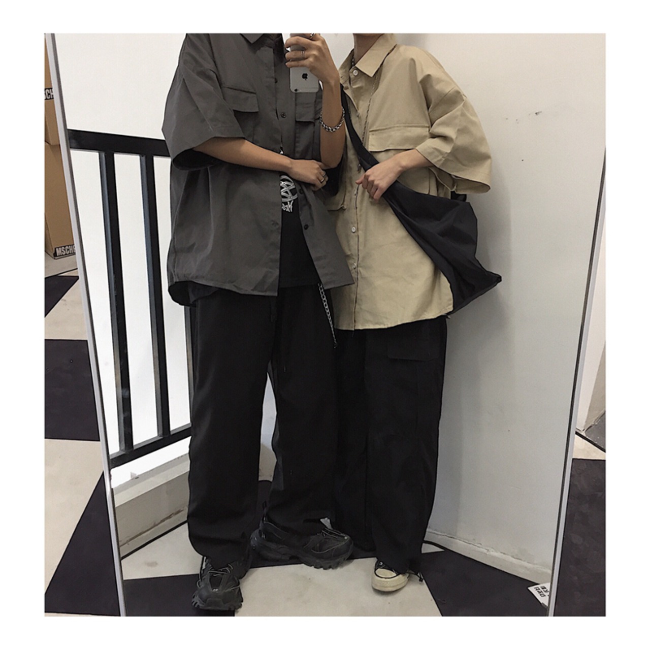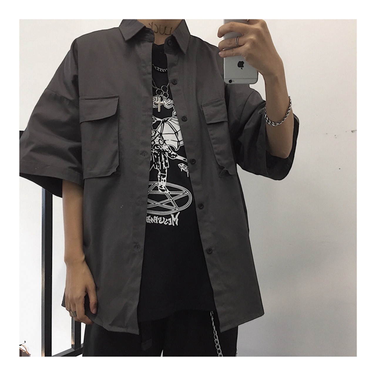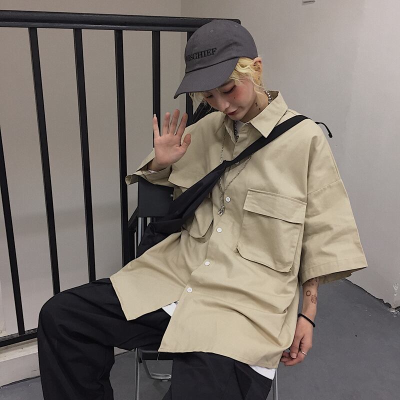 ビッグシャツ トップス シャツ ブラウス ジャケット ストリート カジュアル グレー 灰色 カーキ ミディアム丈 袖あり 半袖 襟付き ストレート ワイド シングルブレスト ボタン ポケット 綿 コットン かっこいい クール デイリーウェア レトロ レトロ風 こなれ感 ルーズ シルエット ラフ 個性的 デザイン 主役級 存在感 無地 夏 サマー 20代 10代 レディース 女性用 メンズ 男性用 男女兼用 ユニセックス 学生 学校 通学 デート お出かけ 女子会 食事会 M L XL