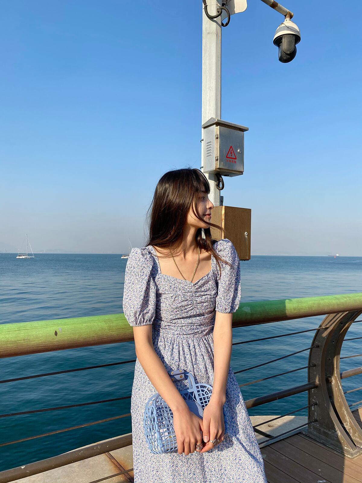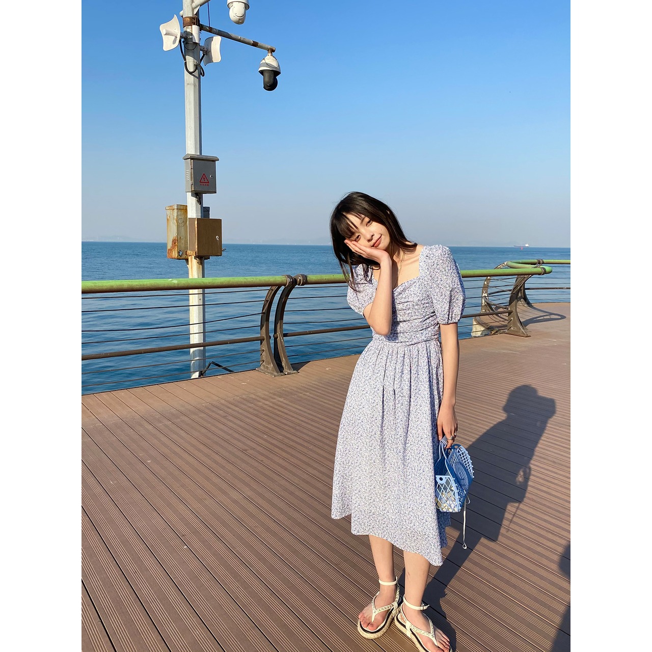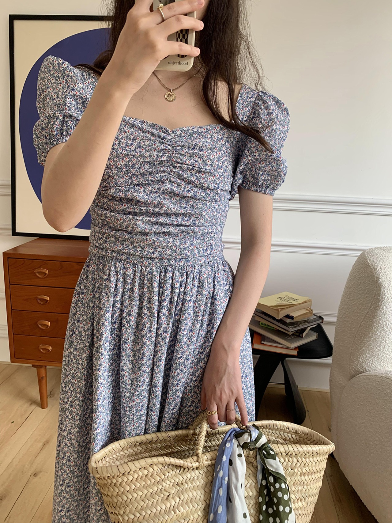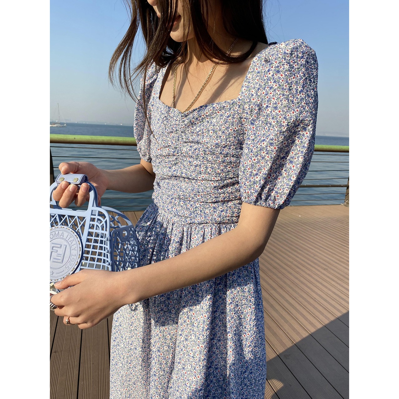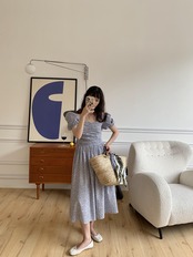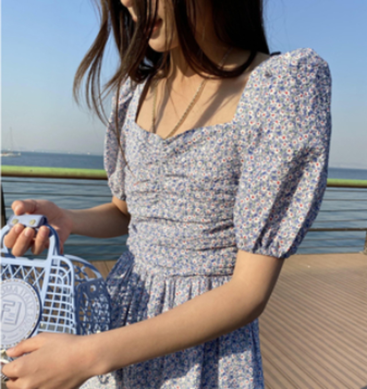 胸元のシャーリングとボリューム袖がかわいい印象に。