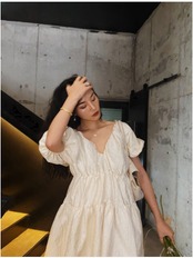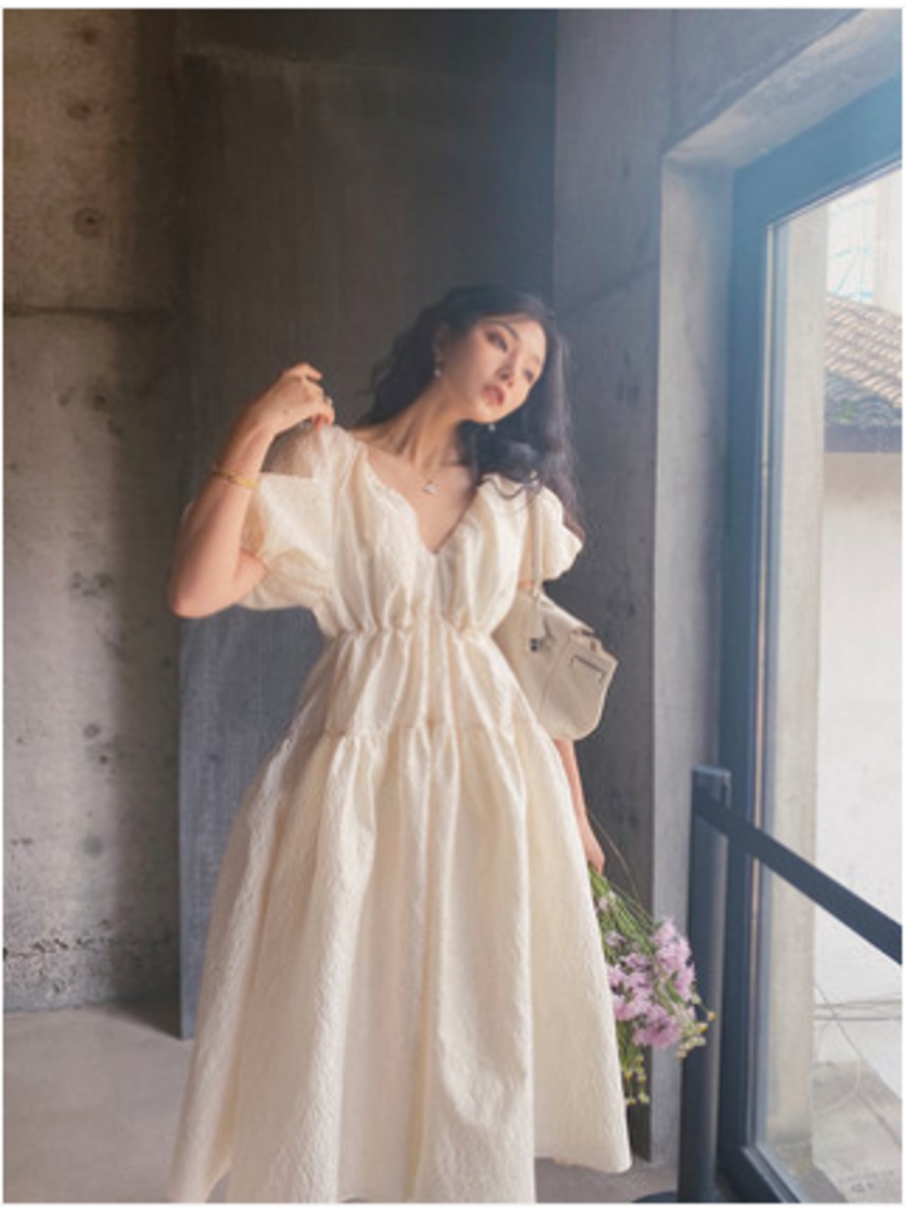 ティアードワンピース トップス スイート ガーリー ホワイト 白 ミドル丈 袖あり 半袖 パフスリーブ Vネック シャーリング 大人女子 大人 上品 おしゃれ デイリーウェア レトロ レトロ風 こなれ感 キュート かわいい 女子 個性的 デザイン 主役級 存在感 無地 春 スプリング 夏 サマー 20代 10代 30代 レディース 女性用 学生 学校 通学 デート お出かけ 女子会 食事会 着回し 普段使い モテ トレンド ファッション コーデ スタイル S M L