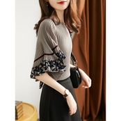トップス Tシャツ ニットソー セーター プルオーバー 袖あり 半袖 5分袖 五分袖 フレアスリーブ ラウンドネック 切り替えデザイン 伸縮性 ニット サマーニット かわいい 大人可愛い きれいめ シンプル カジュアル 上品 おしゃれ お洒落 レトロ 大人女子 こなれ感 ラフ キュート ガーリー ルーズ エレガント フェミニン 花柄 小花柄 フラワー ライン 10代 20代 レディース 学生 通学 デート お出かけ 女子会 休日 着回し 普段使い 重ね着 モテ 体系カバー くすみカラー ニュアンスカラー