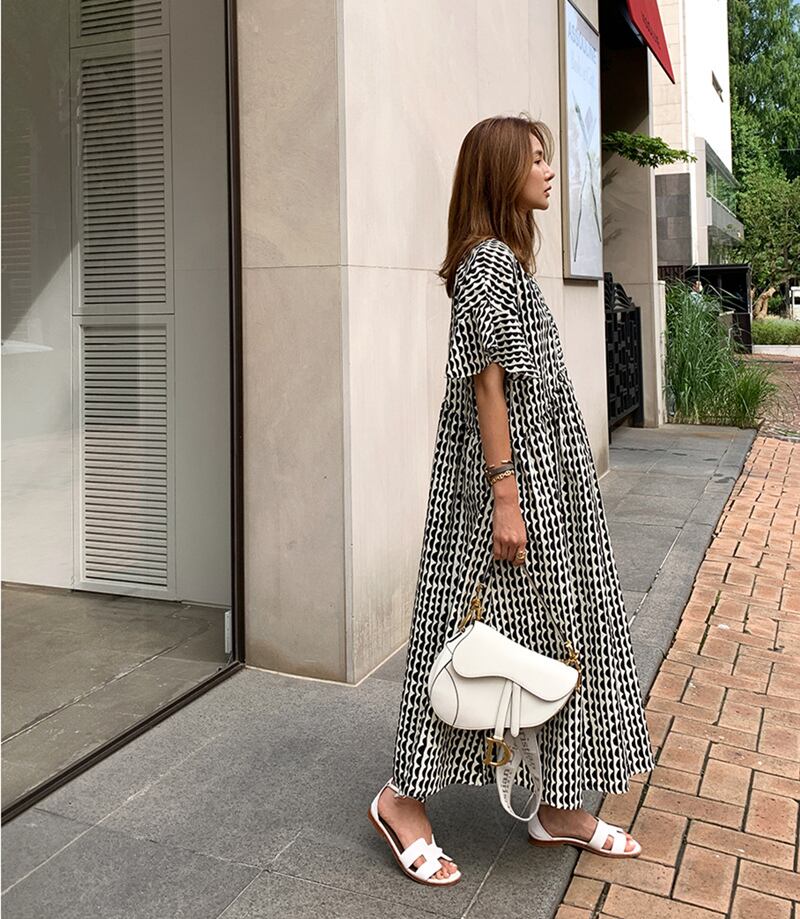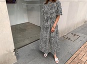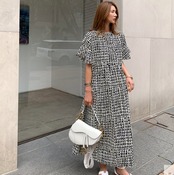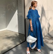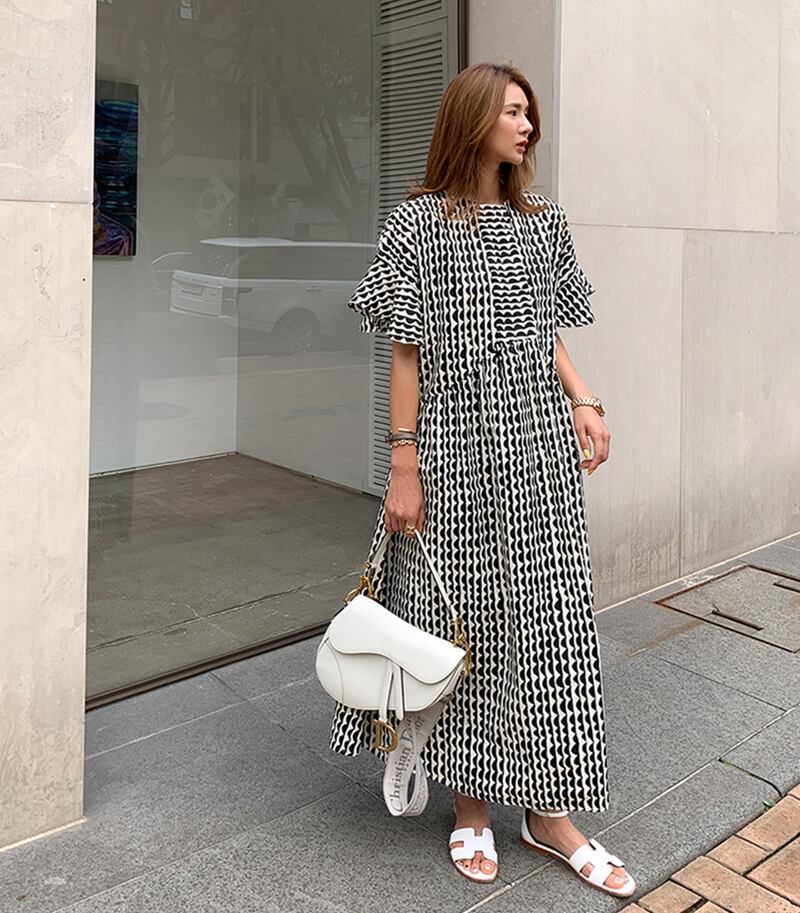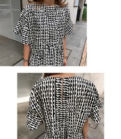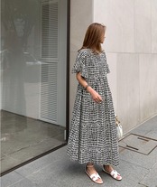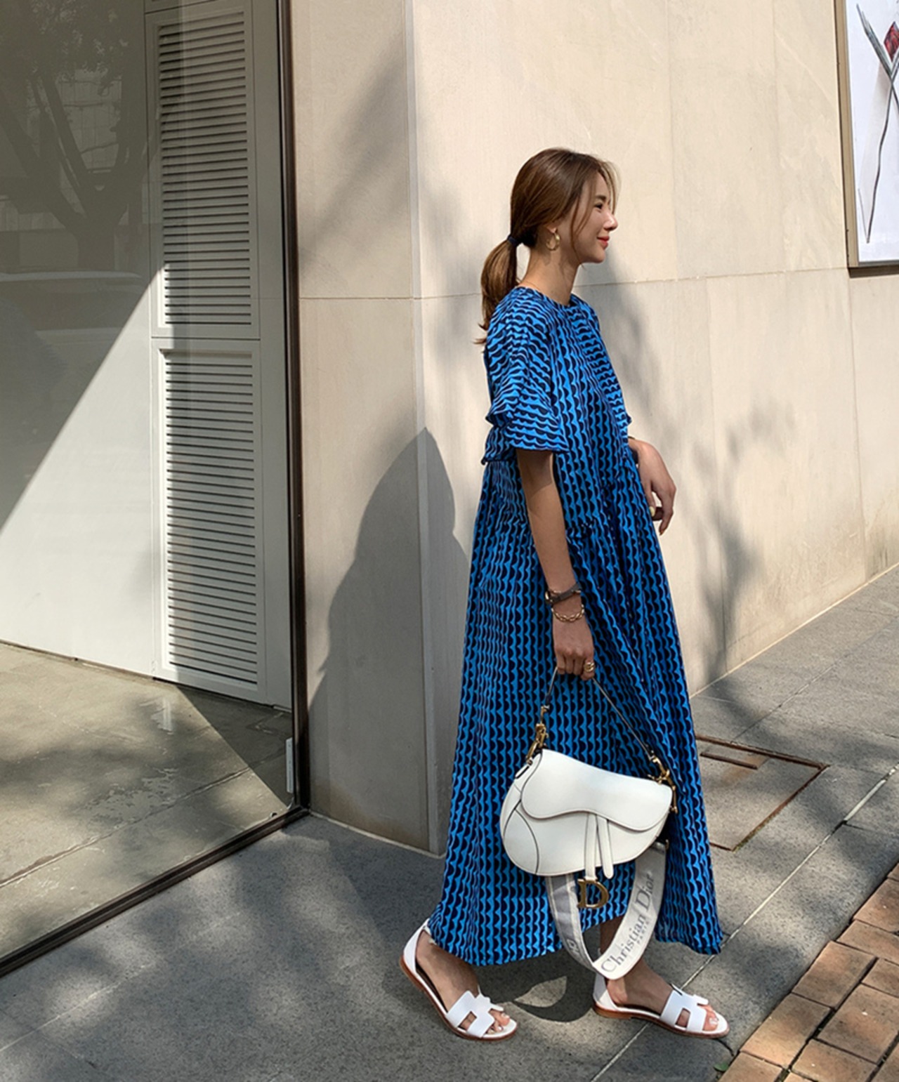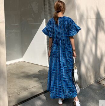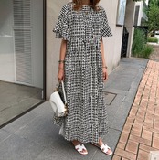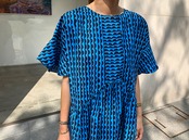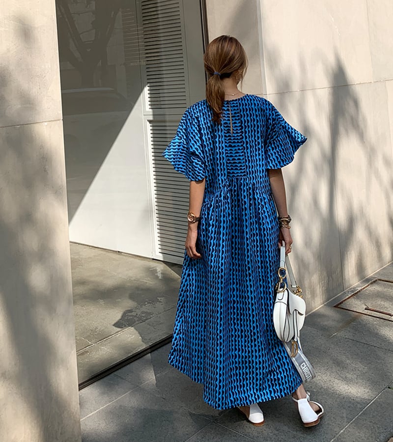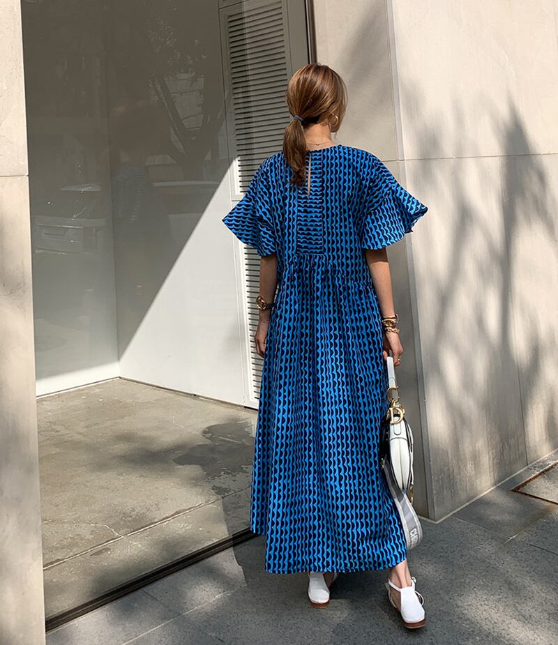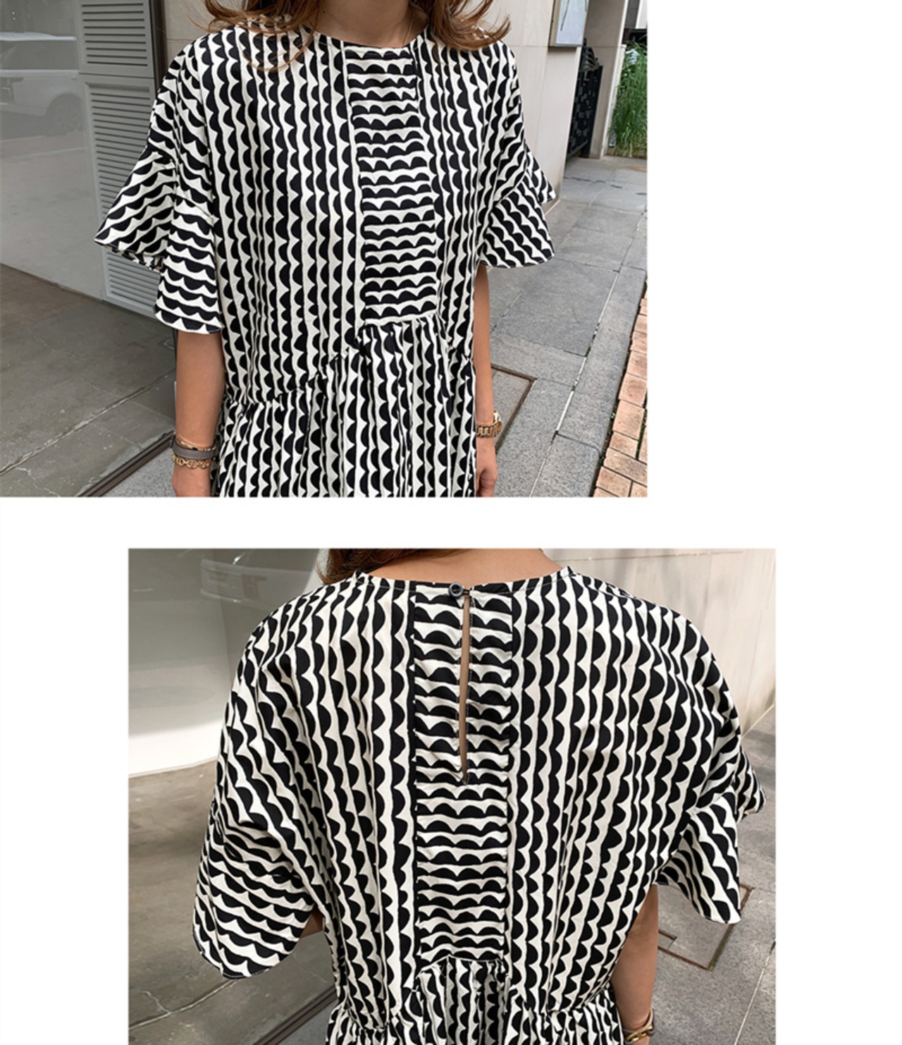 ボリューム袖ワンピース ワンピース スイート ブラック 黒 ブルー 青 ミドル丈 袖あり 半袖 ボリューム袖 フレアスリーブ ラウンドネック Aライン 大人女子 大人 上品 おしゃれ デイリーウェア レトロ レトロ風 こなれ感 ルーズ シルエット ラフ キュート かわいい 女子 個性的 デザイン 主役級 存在感 柄 プリント 夏 サマー 20代 10代 30代 40代 レディース 女性用 ママ 休日 おうち らくちん 着回し 普段使い S M L XL