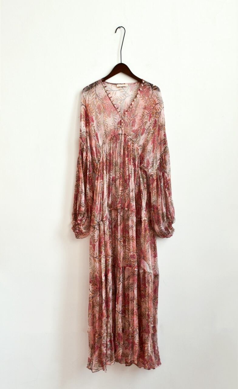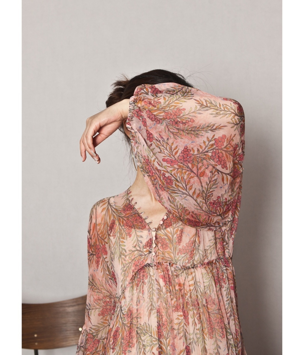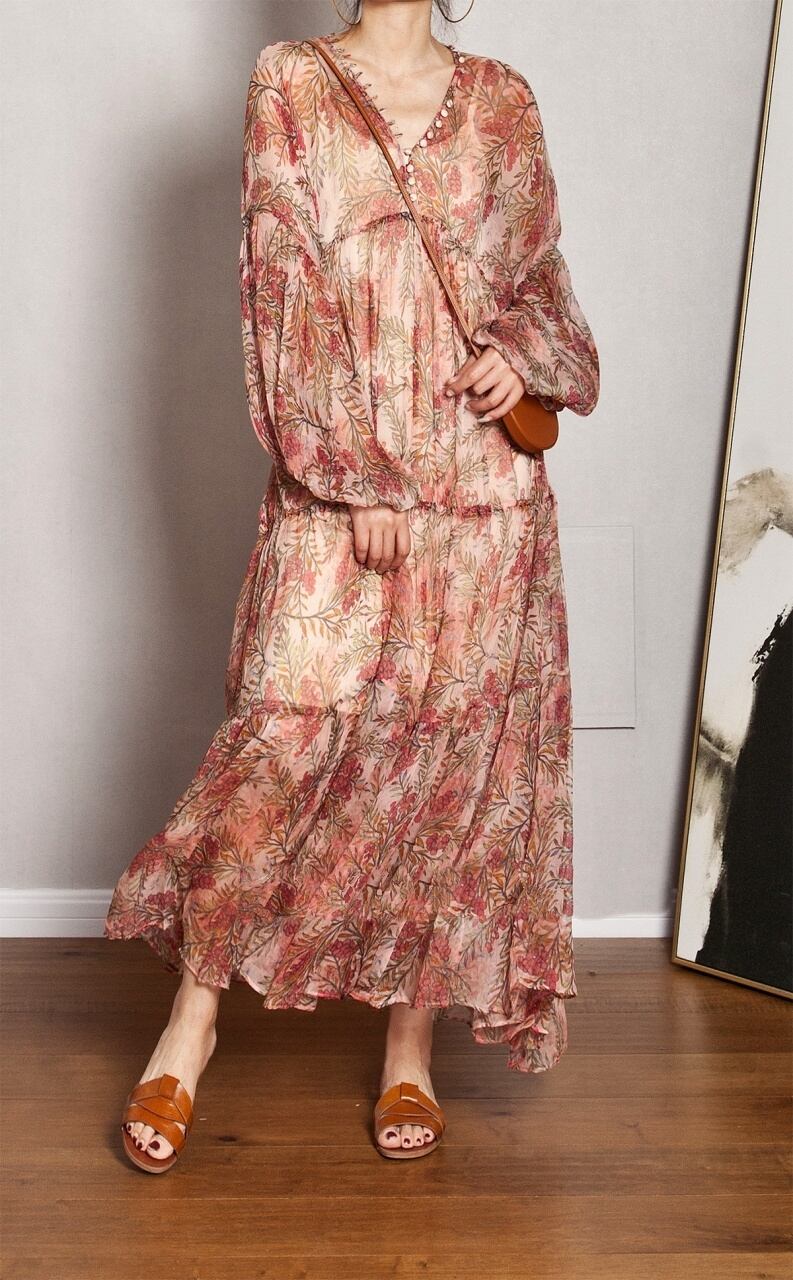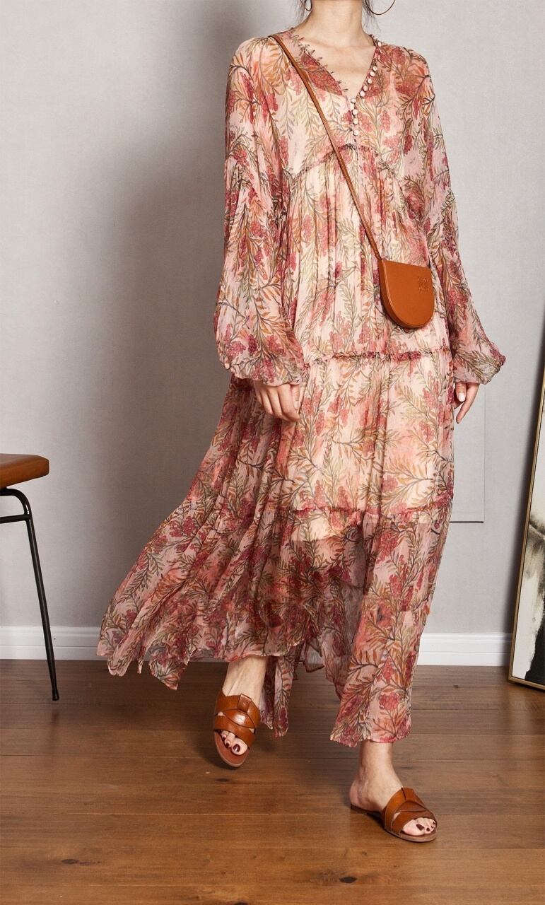 ワンピース フレアワンピース ティアードワンピース ロング ロング丈 マキシ マキシ丈 袖あり 長袖 ボリューム袖 パフスリーブ Vネック ヘンリーネック フレア Aライン シフォン 透け感 ボタン 薄手 かわいい 大人可愛い カジュアル おしゃれ お洒落 大人可愛い ラフ キュート ガーリー ルーズ エレガント とろみ感 抜け感 フェミニン 花柄 小花柄 フラワー ボタニカル 春 夏 20代 30代 レディース デート お出かけ リゾート 海 普段使い 楽ちん モテ 体系カバー S M ゆったり ゆる