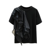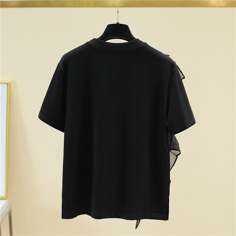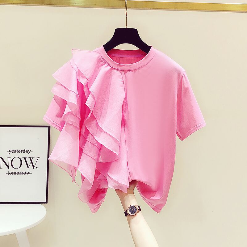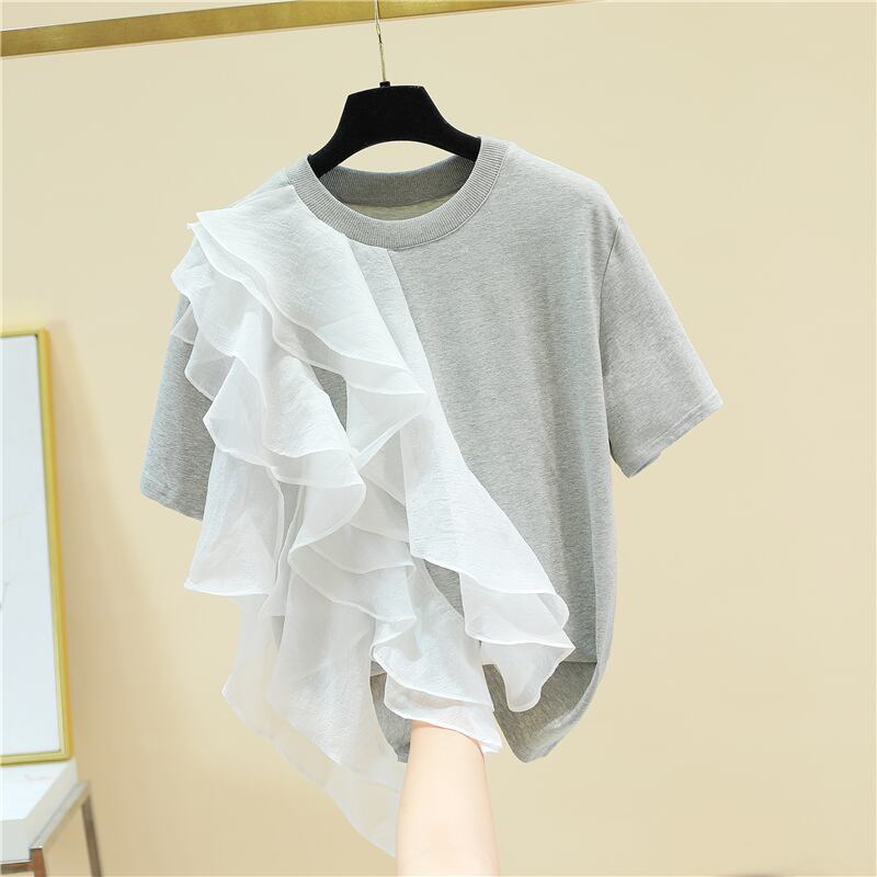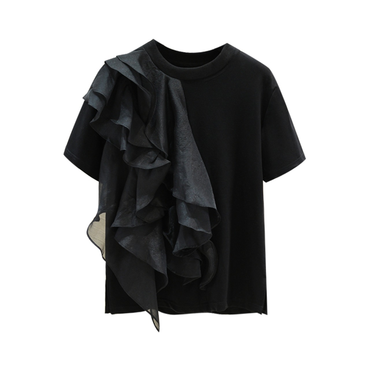フリルTシャツ トップス Tシャツ スイート ガーリー ブラック 黒 グレー 灰色 ピンク レギュラー丈 9分丈 袖あり 半袖 ラウンドネック フリル 透け感 シアー 大人女子 大人 上品 おしゃれ デイリーウェア レトロ レトロ風 こなれ感 ルーズ シルエット ラフ キュート かわいい 女子 個性的 デザイン 主役級 存在感 無地 夏 サマー 20代 10代 30代 レディース 女性用 学生 学校 通学 デート お出かけ 女子会 食事会 着回し 普段使い S M L XL