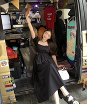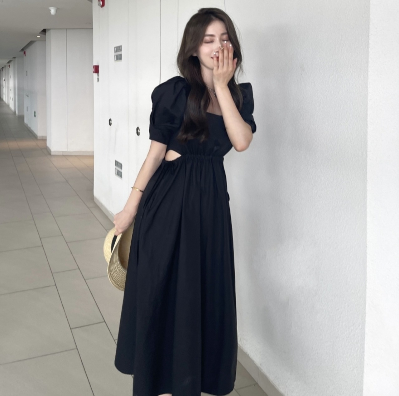 パフスリーブワンピース ワンピース スイート ガーリー ブラック 黒 ミドル丈 9分丈 袖あり 半袖 ボリューム袖 スクエアネック フレア カットアウト くりぬき 大人女子 大人 上品 おしゃれ デイリーウェア レトロ レトロ風 こなれ感 ルーズ シルエット ラフ キュート かわいい 女子 個性的 デザイン 主役級 存在感 無地 夏 サマー 20代 10代 レディース 女性用 学生 学校 通学 デート お出かけ 女子会 食事会 着回し 普段使い S M L XL