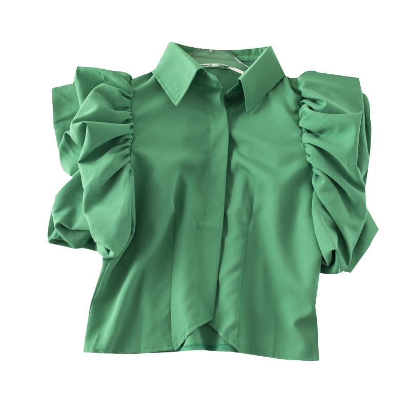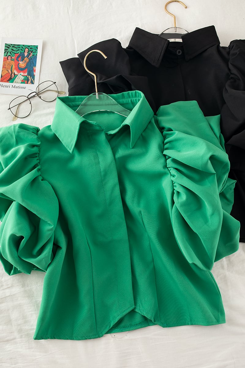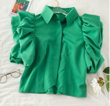 パフスリーブシャツ トップス シャツ ブラウス スイート ガーリー ブラック 黒 ホワイト 白 グリーン 緑 ショート丈 袖あり 半袖 ボリューム袖 襟付き フリル 透け感 シアー 大人女子 大人 上品 おしゃれ デイリーウェア レトロ レトロ風 こなれ感 ルーズ シルエット ラフ キュート かわいい 女子 個性的 デザイン 主役級 存在感 無地 夏 サマー 20代 10代 30代 レディース 女性用 デート お出かけ 女子会 食事会 トレンド ワンサイズ