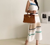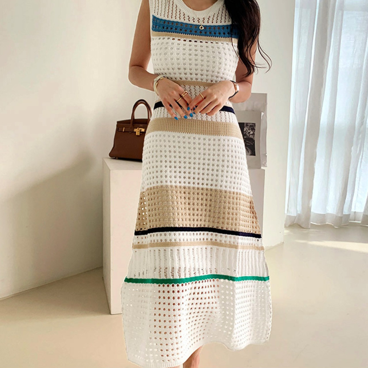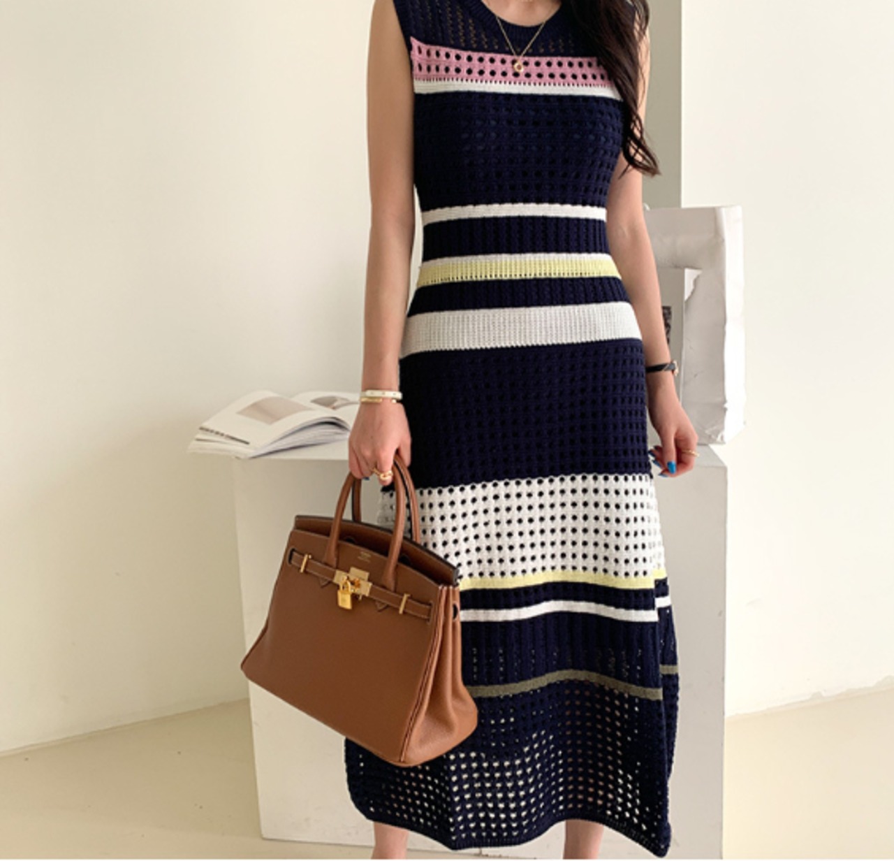 コントラストカラーが目を引くノースリーブニットワンピース
