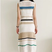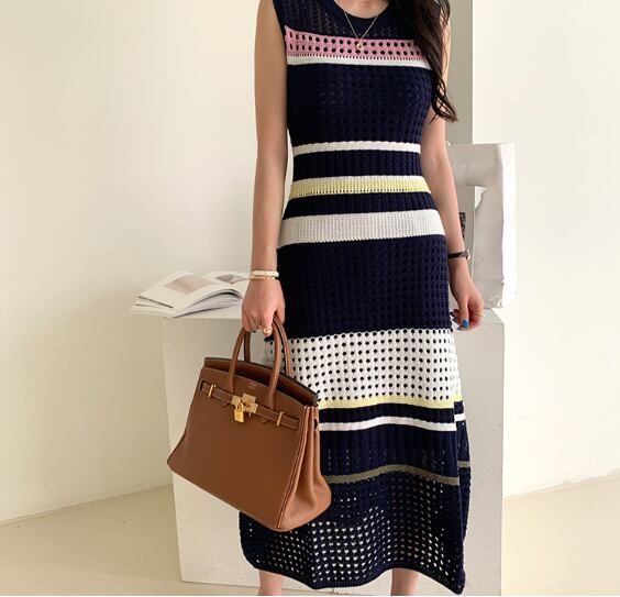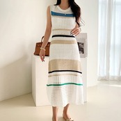 ノースリーブニットワンピース トップス カジュアル ブラック 黒 ホワイト 白 カーキ ミドル丈 袖なし ノースリーブ ラウンドネック スリム 細身 タイト 透かし編み 大人女子 大人 上品 おしゃれ デイリーウェア レトロ レトロ風 こなれ感 キュート かわいい 女子 個性的 デザイン 主役級 存在感 柄 コントラストカラー ストライプ 縞模様 ボーダー 夏 サマー 20代 10代 30代 40代 レディース 女性用 学生 学校 通学 重ね着 レイヤード ワンサイズ