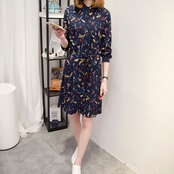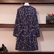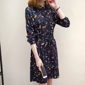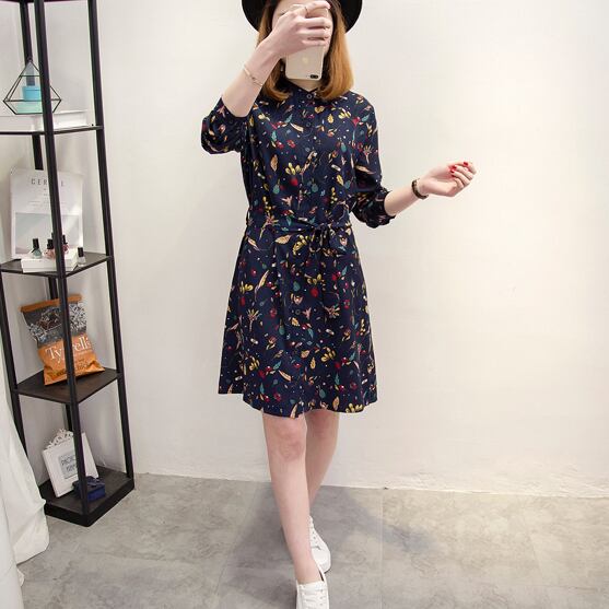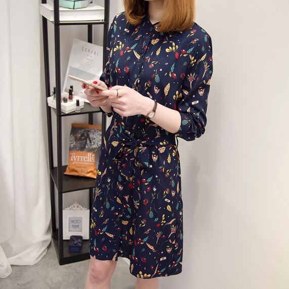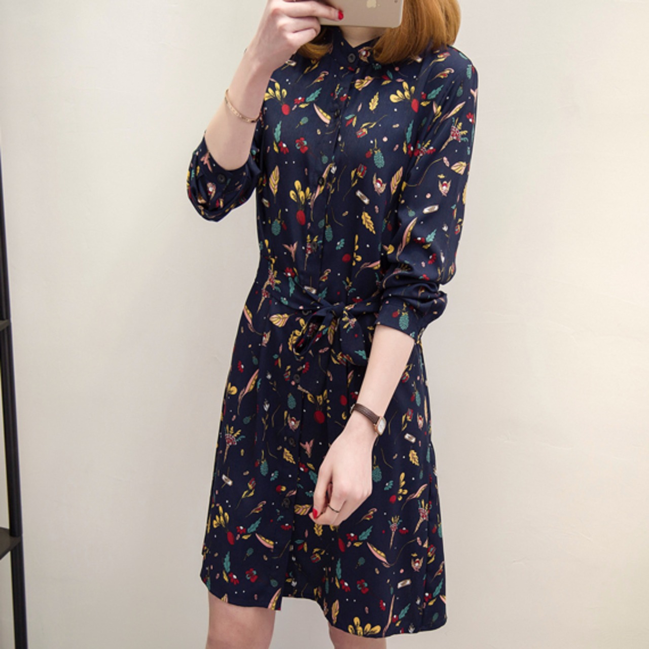 ワンピース シャツワンピース ひざ丈 スタンドカラー ウエストリボン 前開き ボタニカル かわいい 大人可愛い シンプル カジュアル 大人 上品 レトロ 大人カジュアル 大人女子 マニッシュ シック 秋 10代 20代 30代 40代 レディース OL 学生 デート お出かけ 公園デビュー 女子会 旅行 高原 レストラン 着回し 普段使い 重ね着 コーデ モテ 美脚 きちんと感 ネイビー 秋カラー