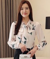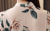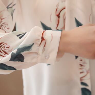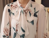 優しい色合いのバラ柄が美しいボウタイブラウスです。