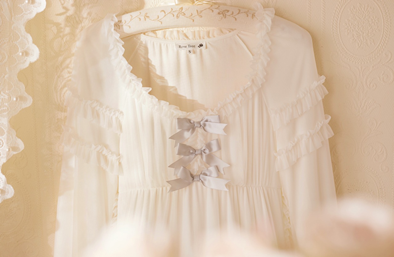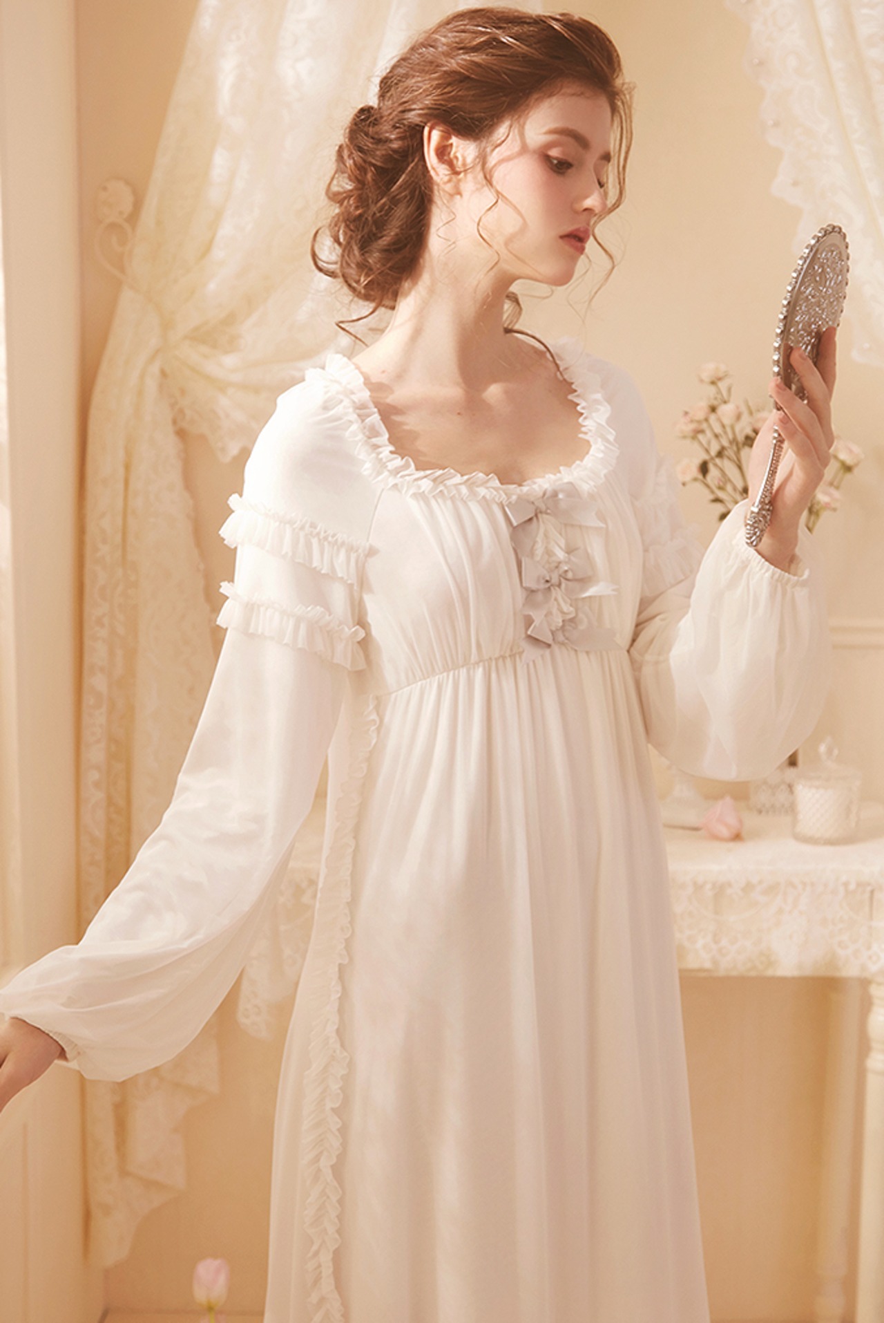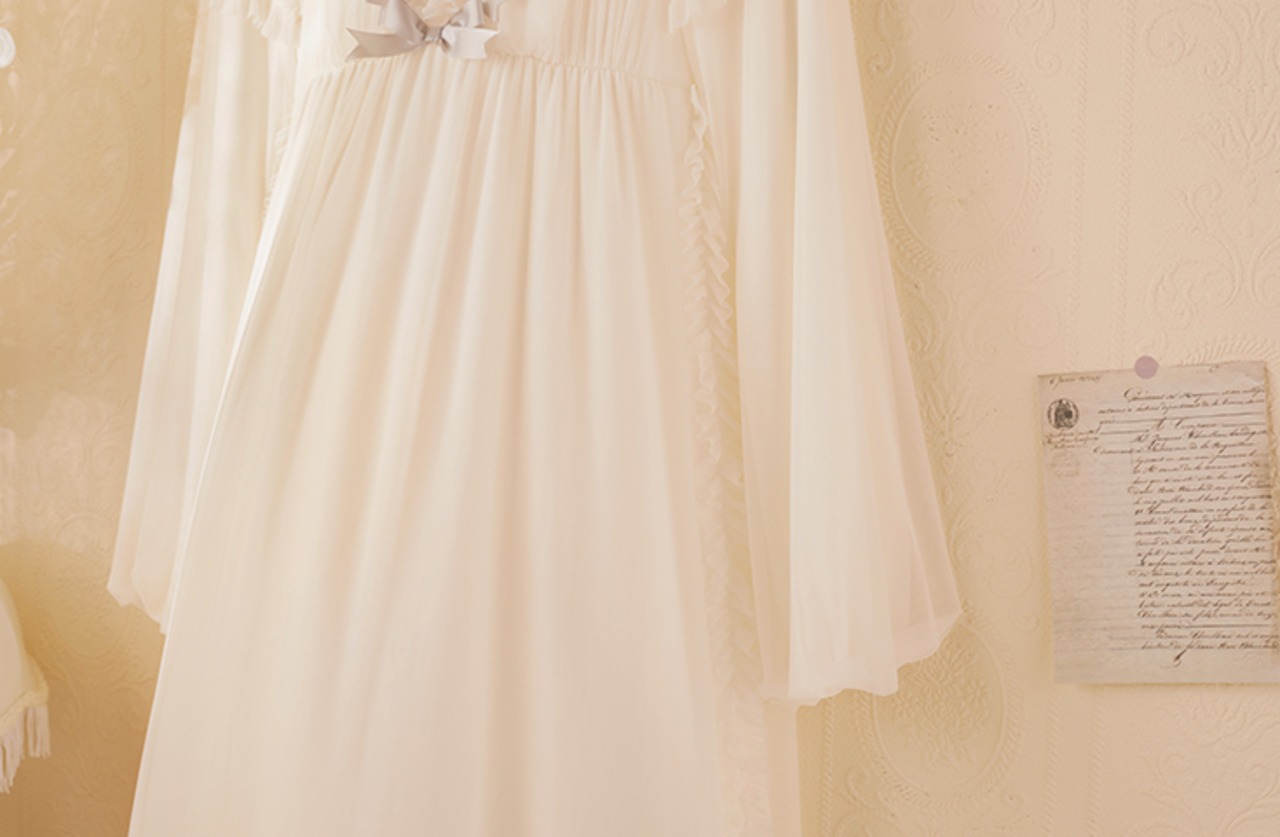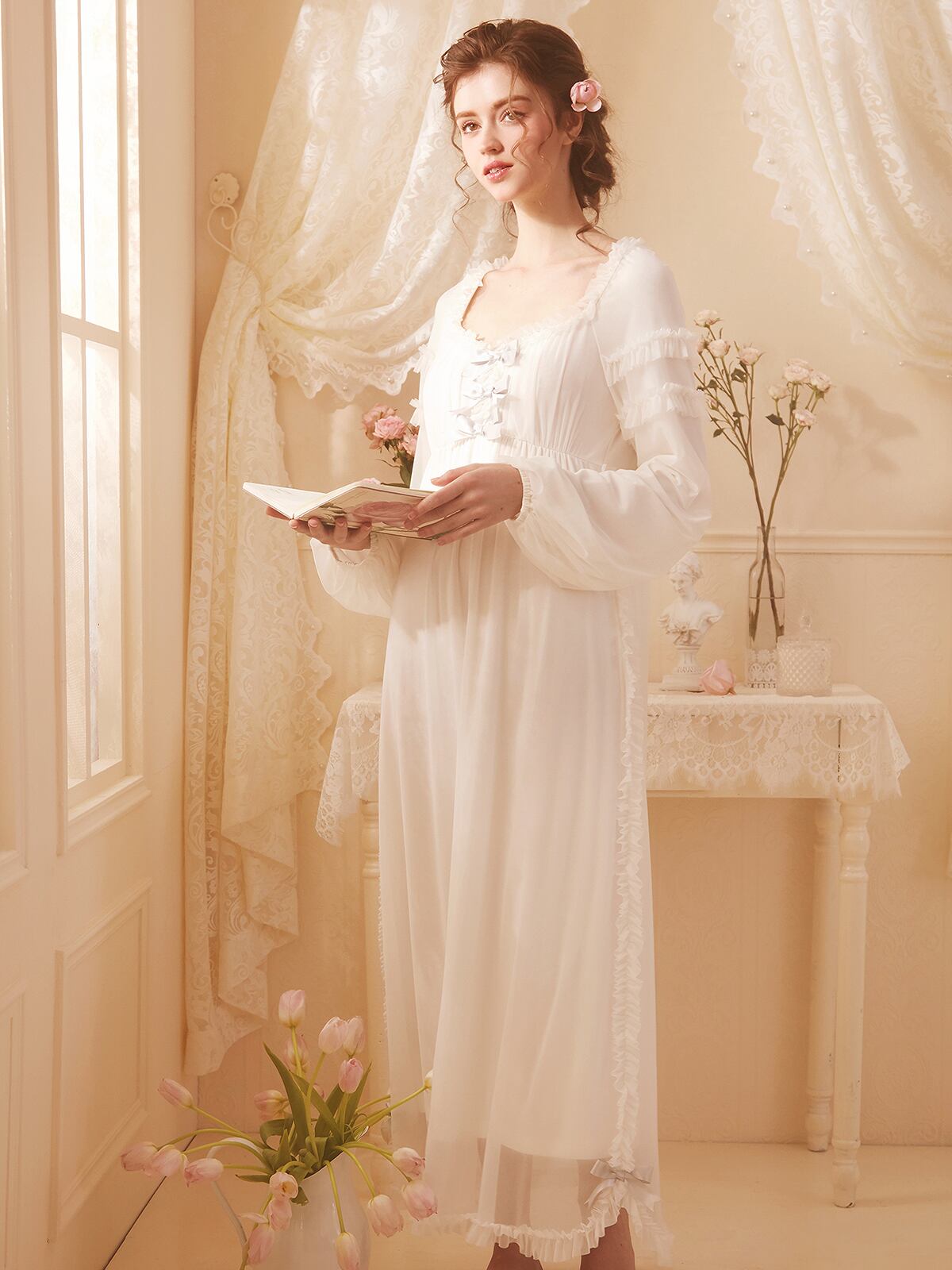 ルームウェア パジャマ ネグリジェ ミモレ ミモレ丈 袖あり 長袖 スクエアネック セミフレア Aライン レース 刺繍 チュール シフォン フリル リボン 透け感 シースルー おしゃれ お洒落 ラブリー キュート ガーリー セクシー エレガント とろみ感 抜け感 春 夏 秋 冬 オールシーズン シーズンレス 10代 20代 30代 40代 60代 レディース 女性用 ママ マタニティ モテ 体系カバー プレゼント ギフト インスタ映え M XL 白 ホワイト