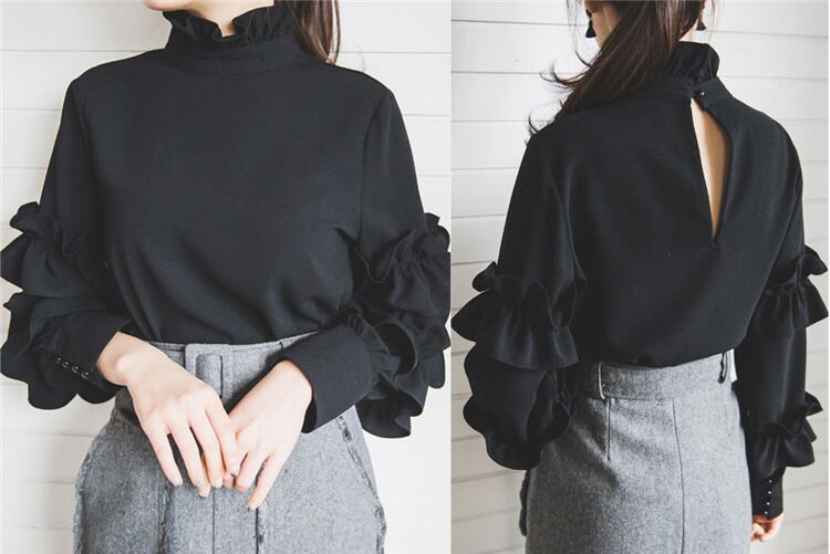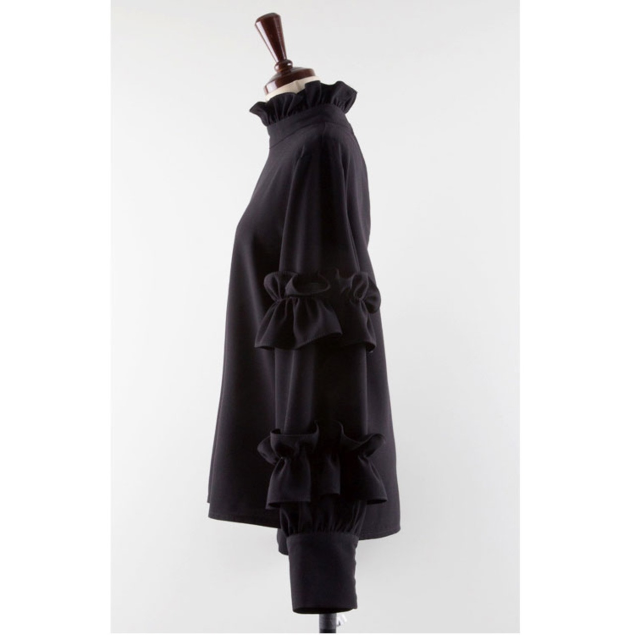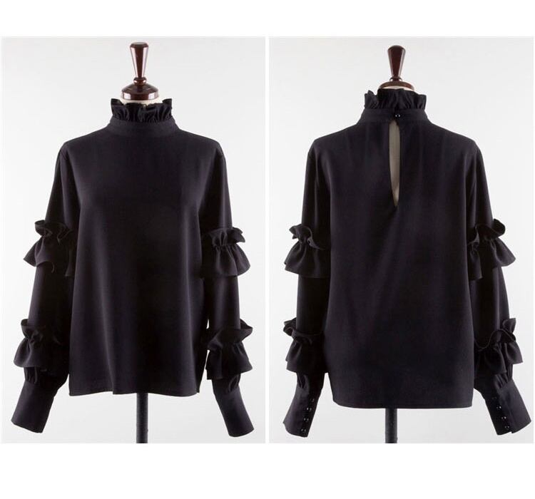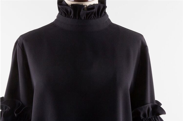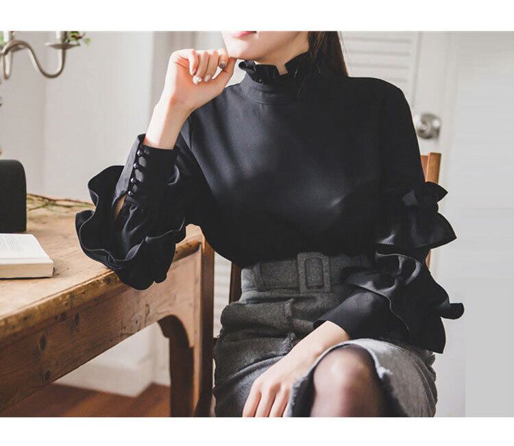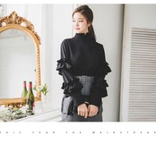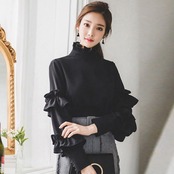 襟元や袖のフリルが可愛らしいタートルネックブラウス。